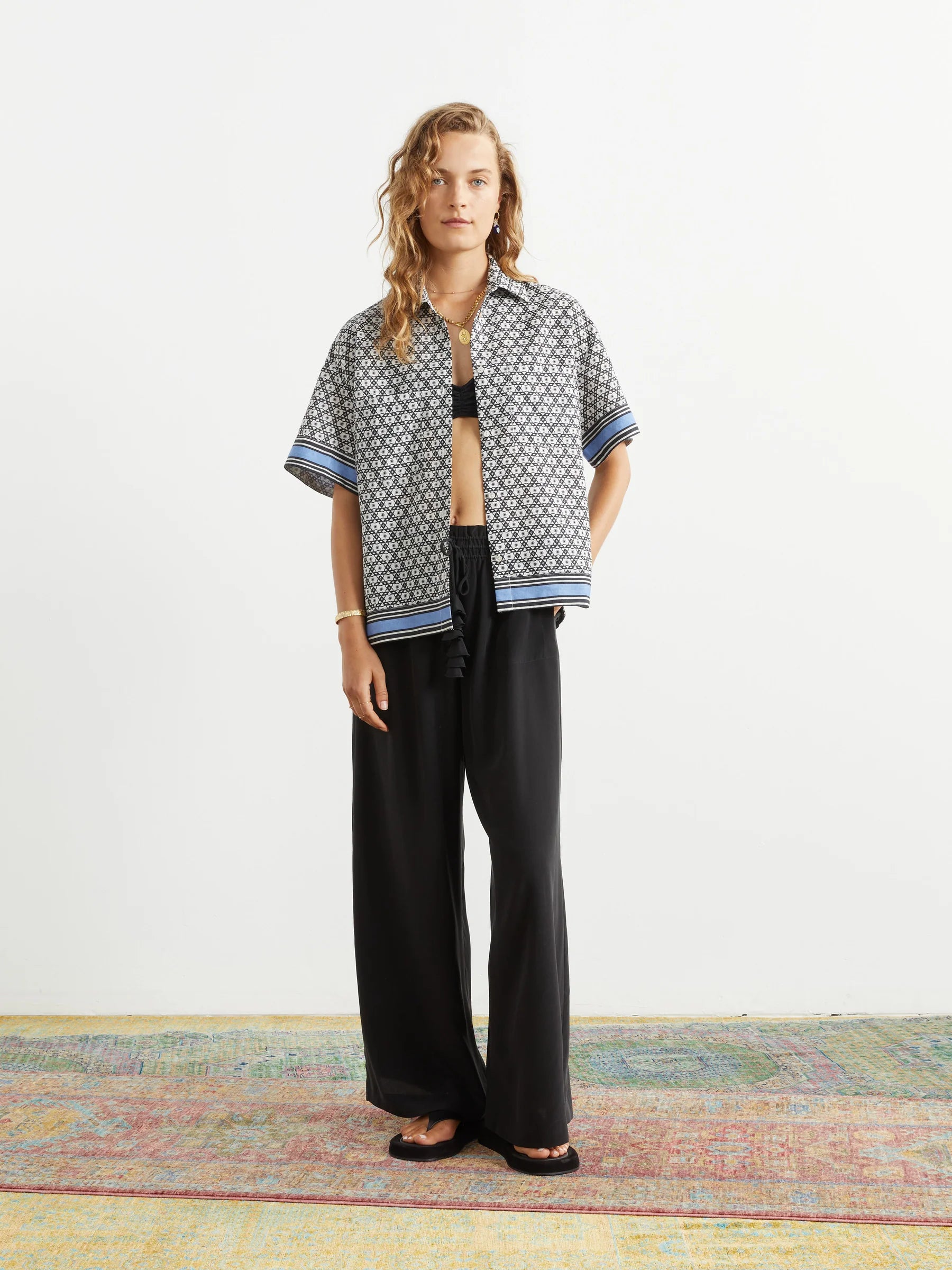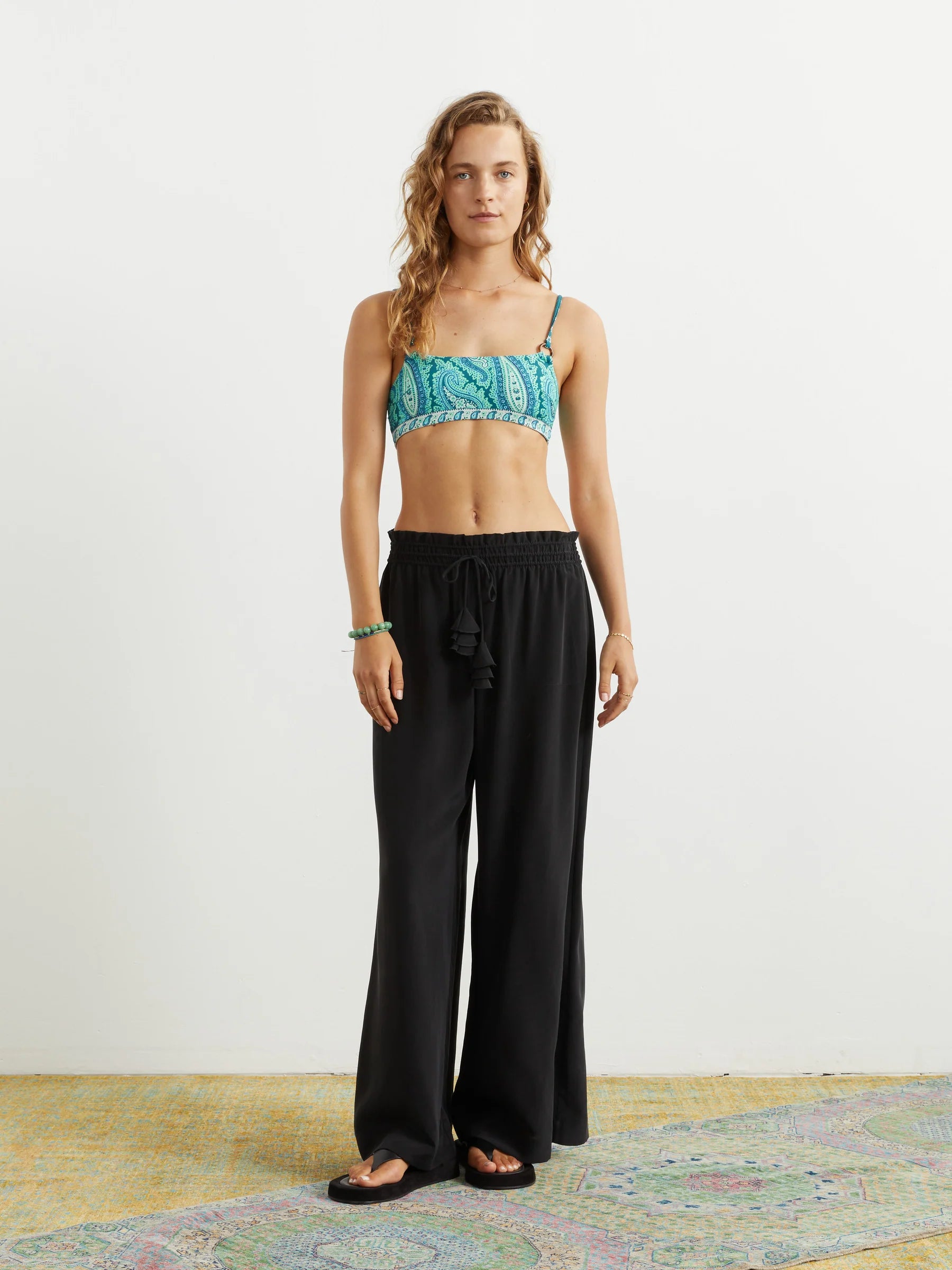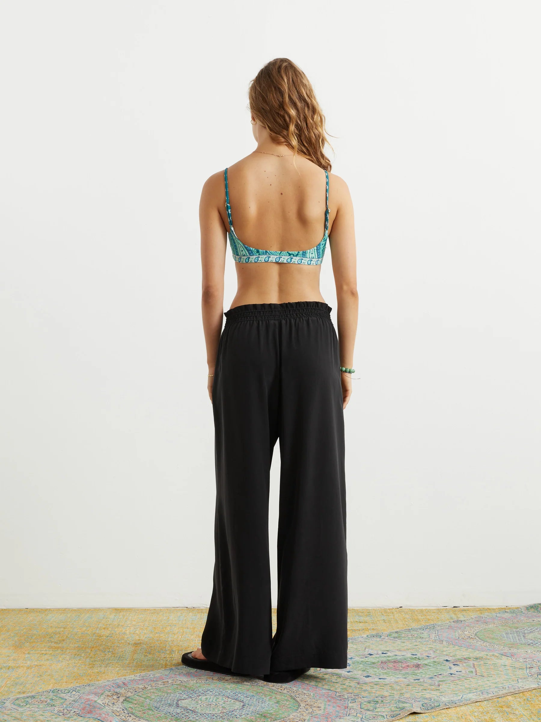 Classic silk pant with subtle wide leg. 7/8 length with soft elastic waist, featuring mock waist tie and functional front pockets. Can be worn on high-waist or lower on hips for a longer length.
