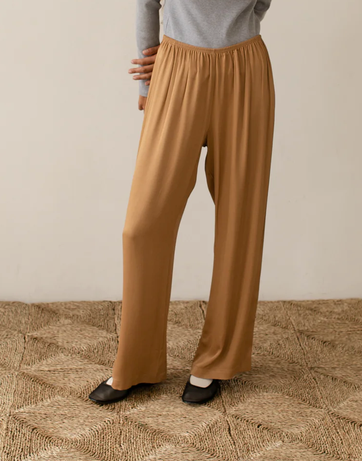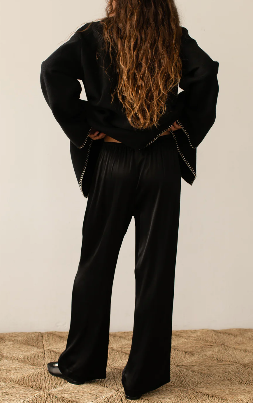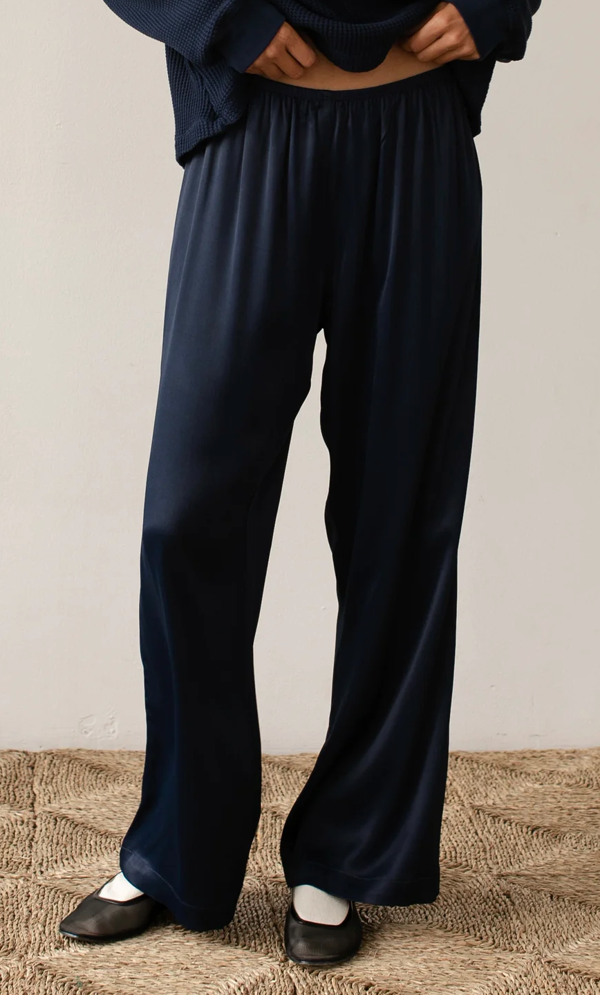 Our signature simple pant crafted with luxe and elevated Satiny, featuring a satin-like sheen, wide leg fit and elastic waistband.