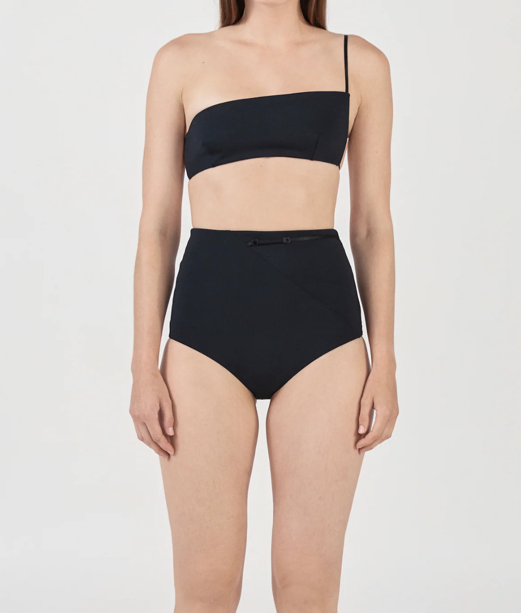 Medium to full coverage, high waist, hight cut leg, bra strap detailing, soft inner lining, medium stretch supportive fabric, biodegradable fabric.