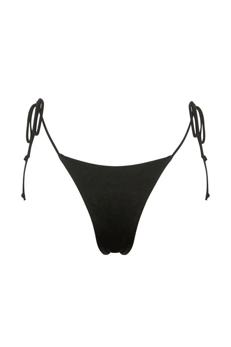 The Juliana Bikini Bottom in Black. A classic string triangle cut, adorned with brushed gold hardware featuring ASTA RESORT's signature Delilah motif, brings an elevated look to a staple style—perfect for your next holiday.