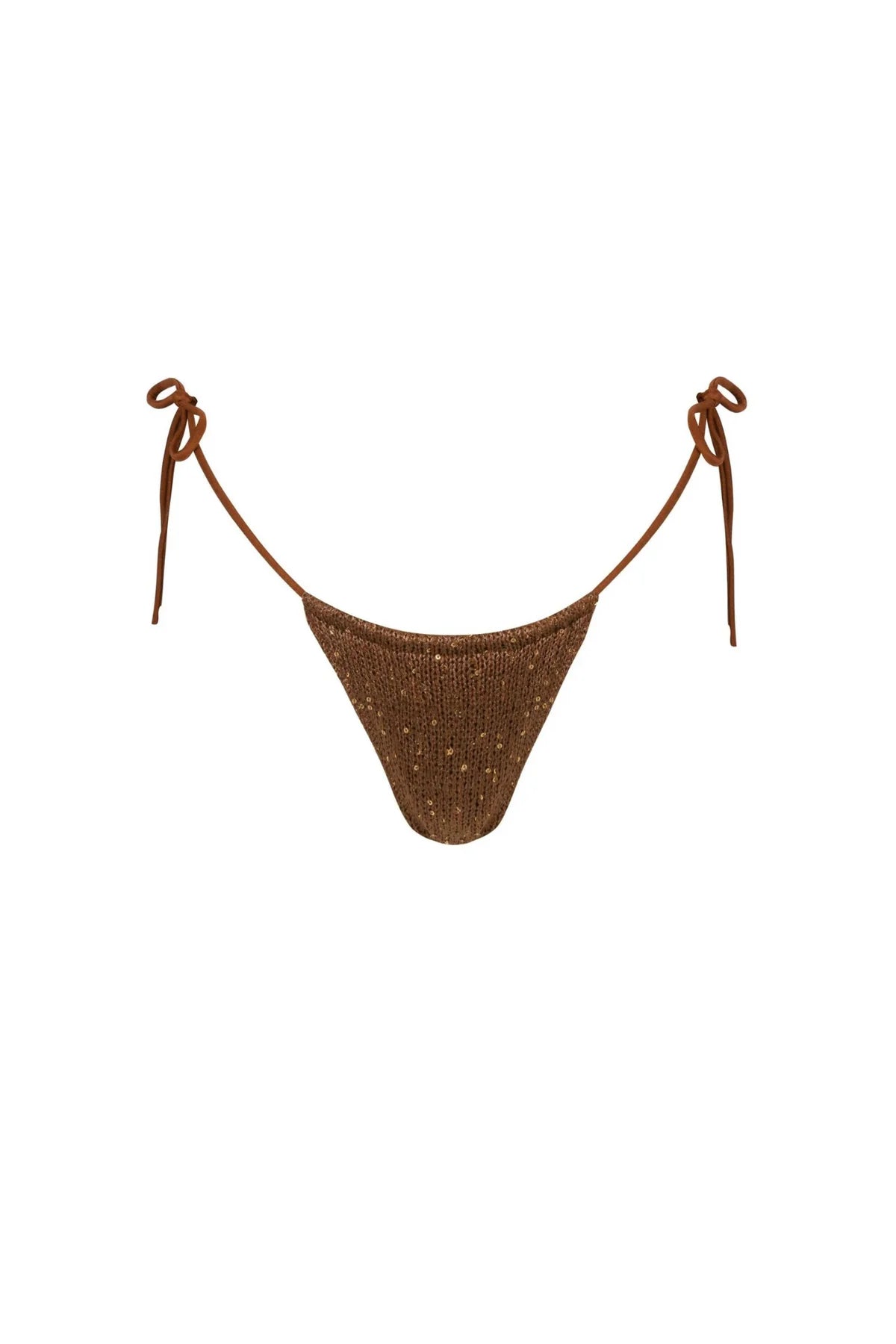 The Lio Bikini Bottom in Cocoa Sequin by ASTA RESORT. An elevated sliding string triangle style layering sequin-spun yarn with Italian lycra, designed to sparkle by the sea.