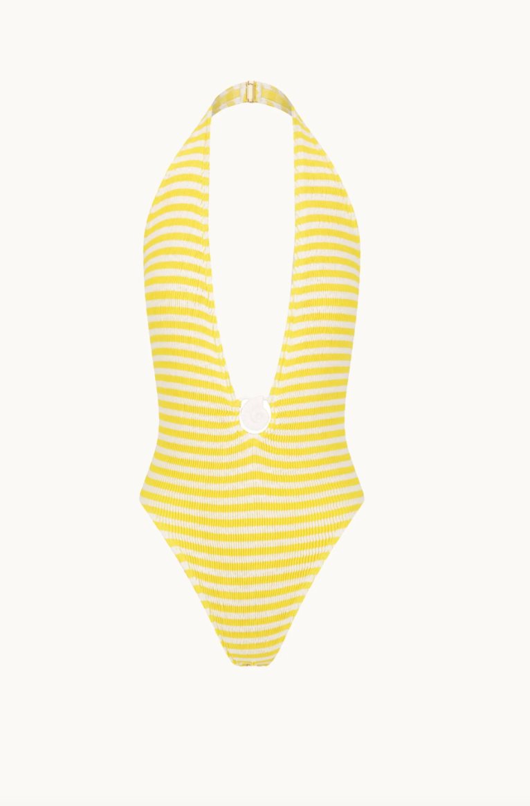 Step into sunshine with our new SPIRAL maillot, a versatile one-piece designed to turn heads. Featuring a multi-wear neckline and an ultra-low scoop back, this swimsuit combines sophistication with a touch of daring. The navel-front shell detail adds a unique accent to this chic piece, perfect for beach or poolside lounging. Crafted in vibrant yellow with delicate stripes, the Spiral Maillot embraces effortless style and summer vibes.