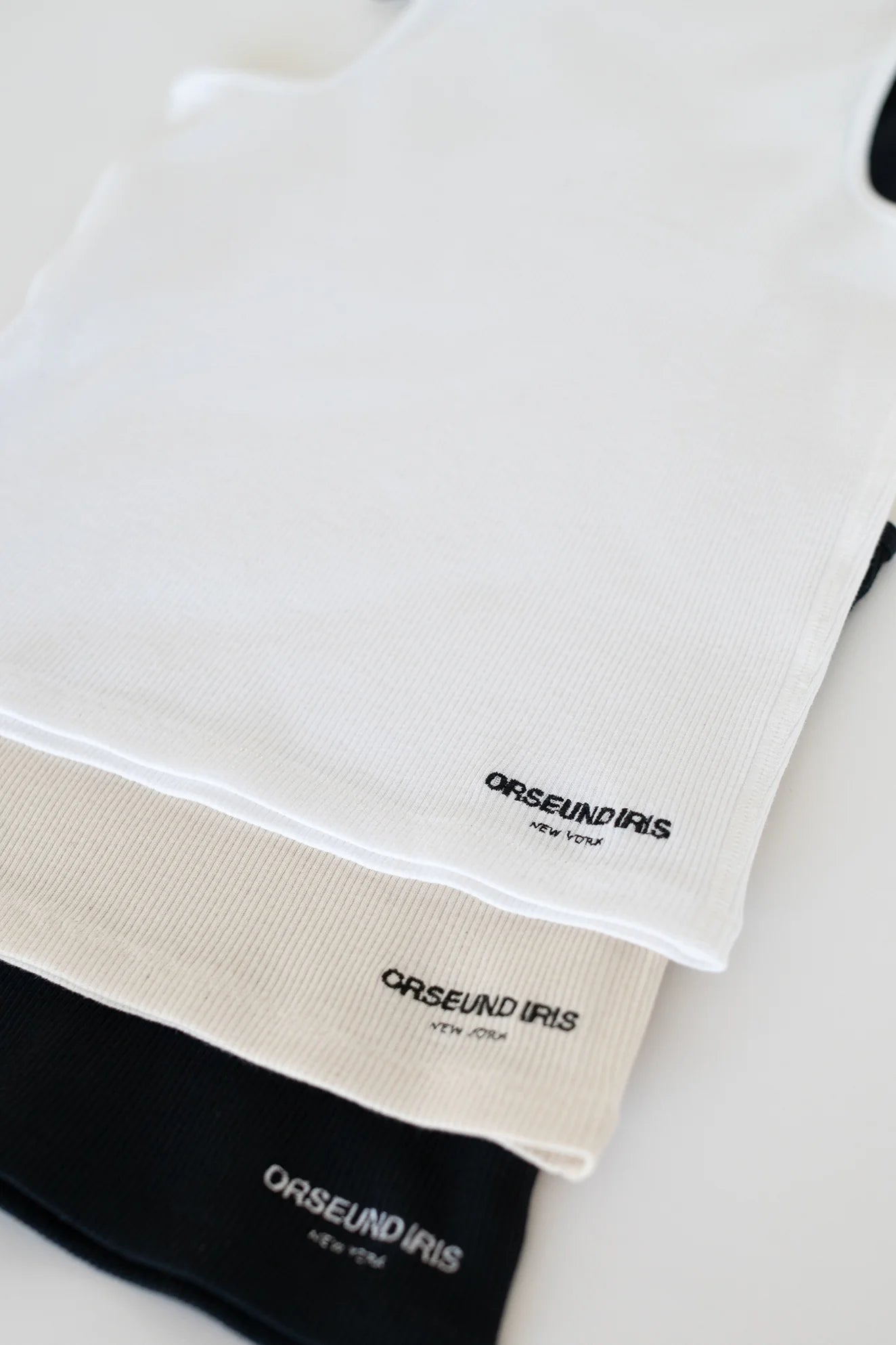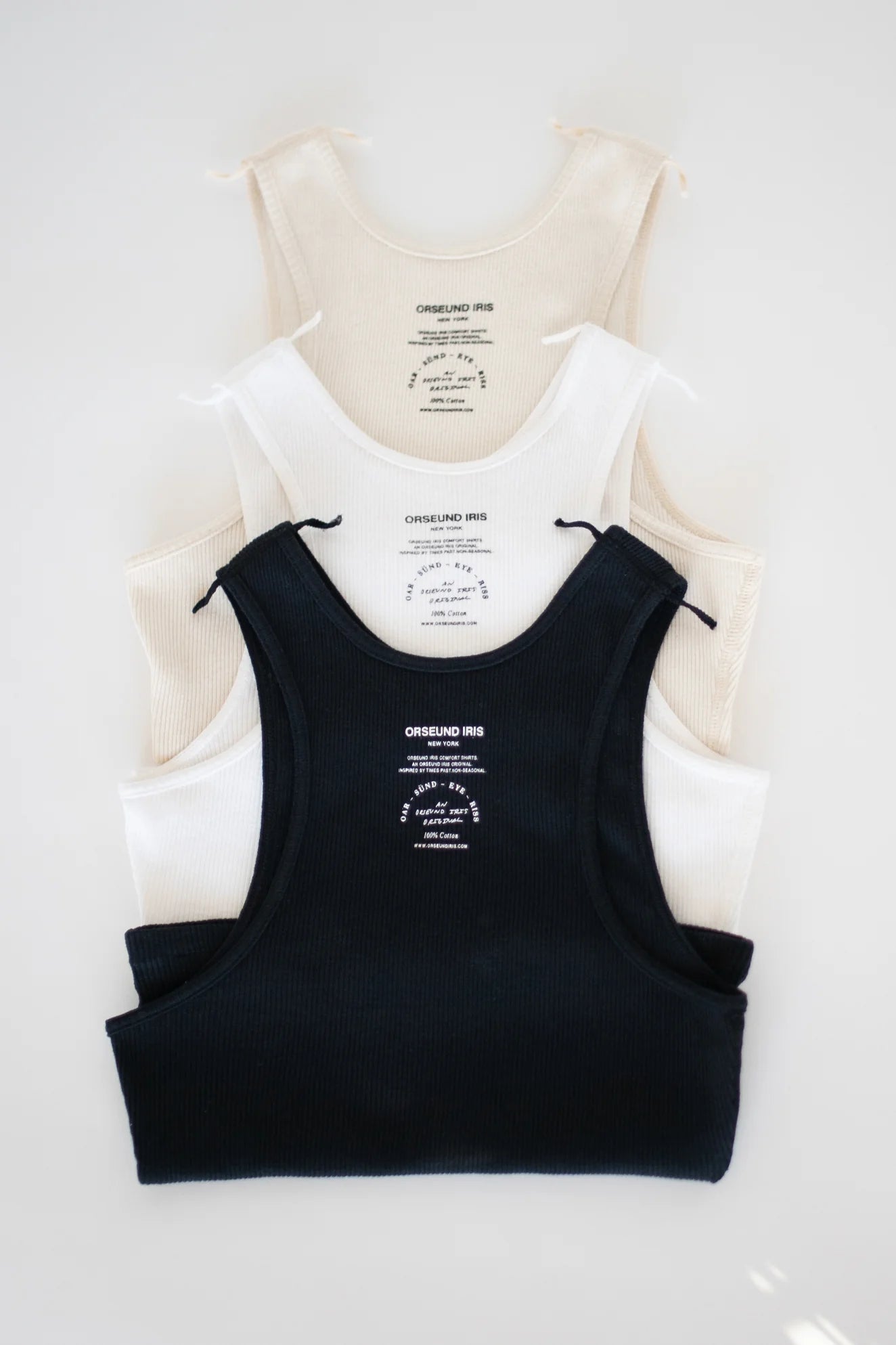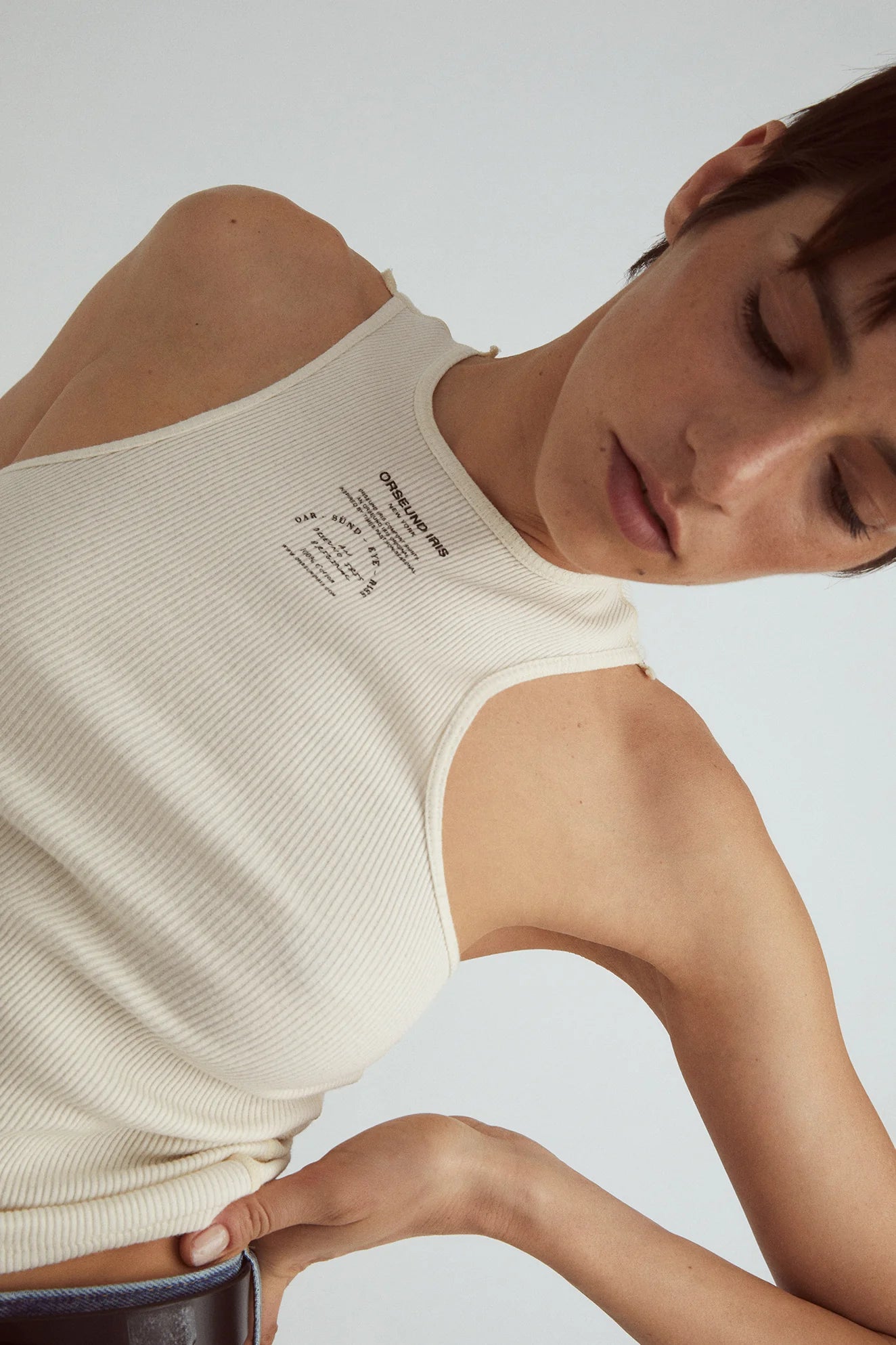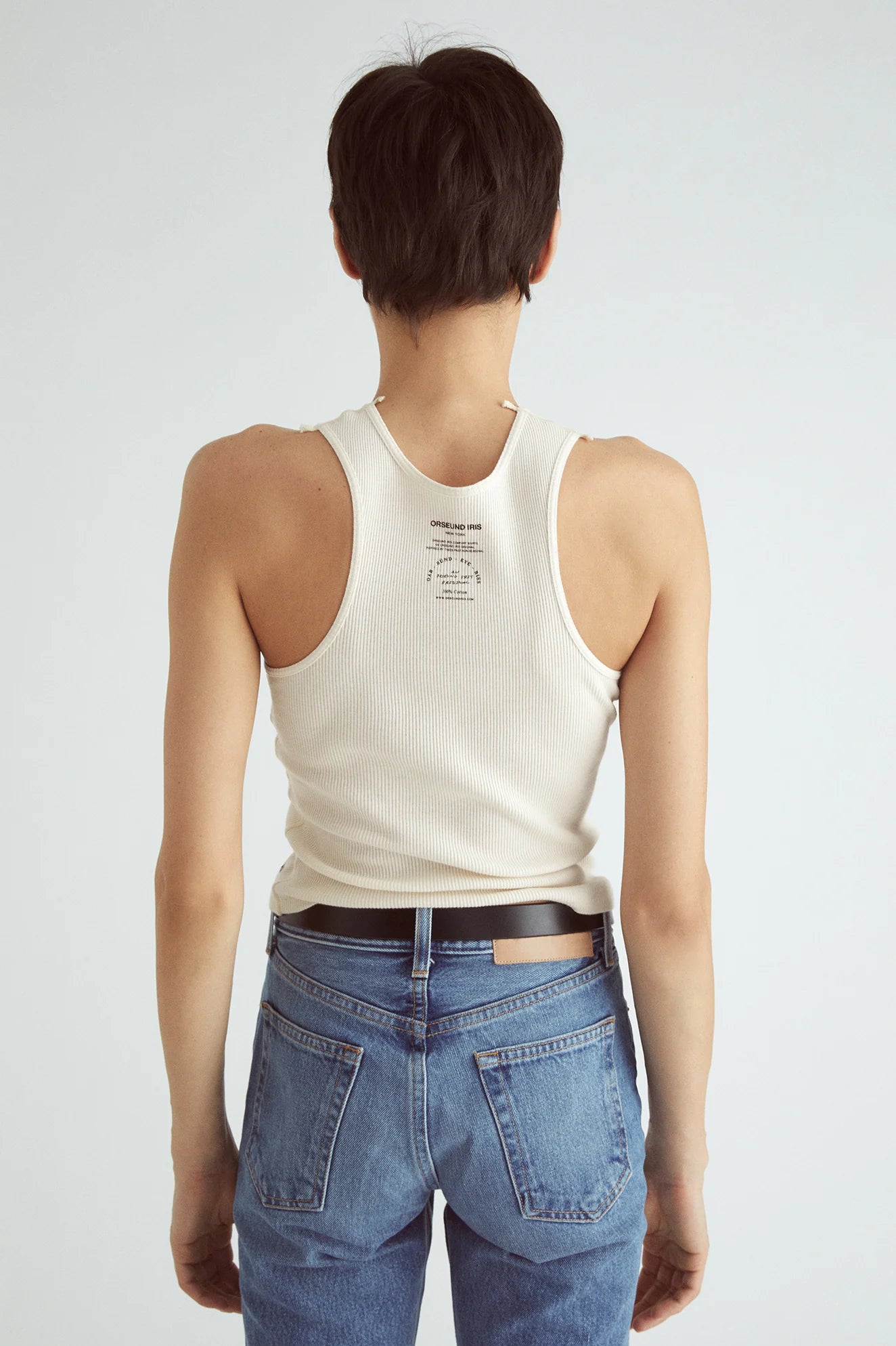 Reversible ribbed cotton tank. Slim racerback silhouette. Original heat transfer label at high neck, embroidered Orseund Iris at back. Serge thread detailing at shoulder seams. With wear, heat transfer label may fade for a more vintage inspired look.