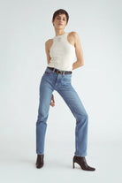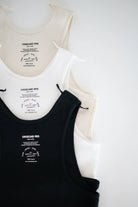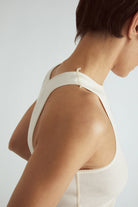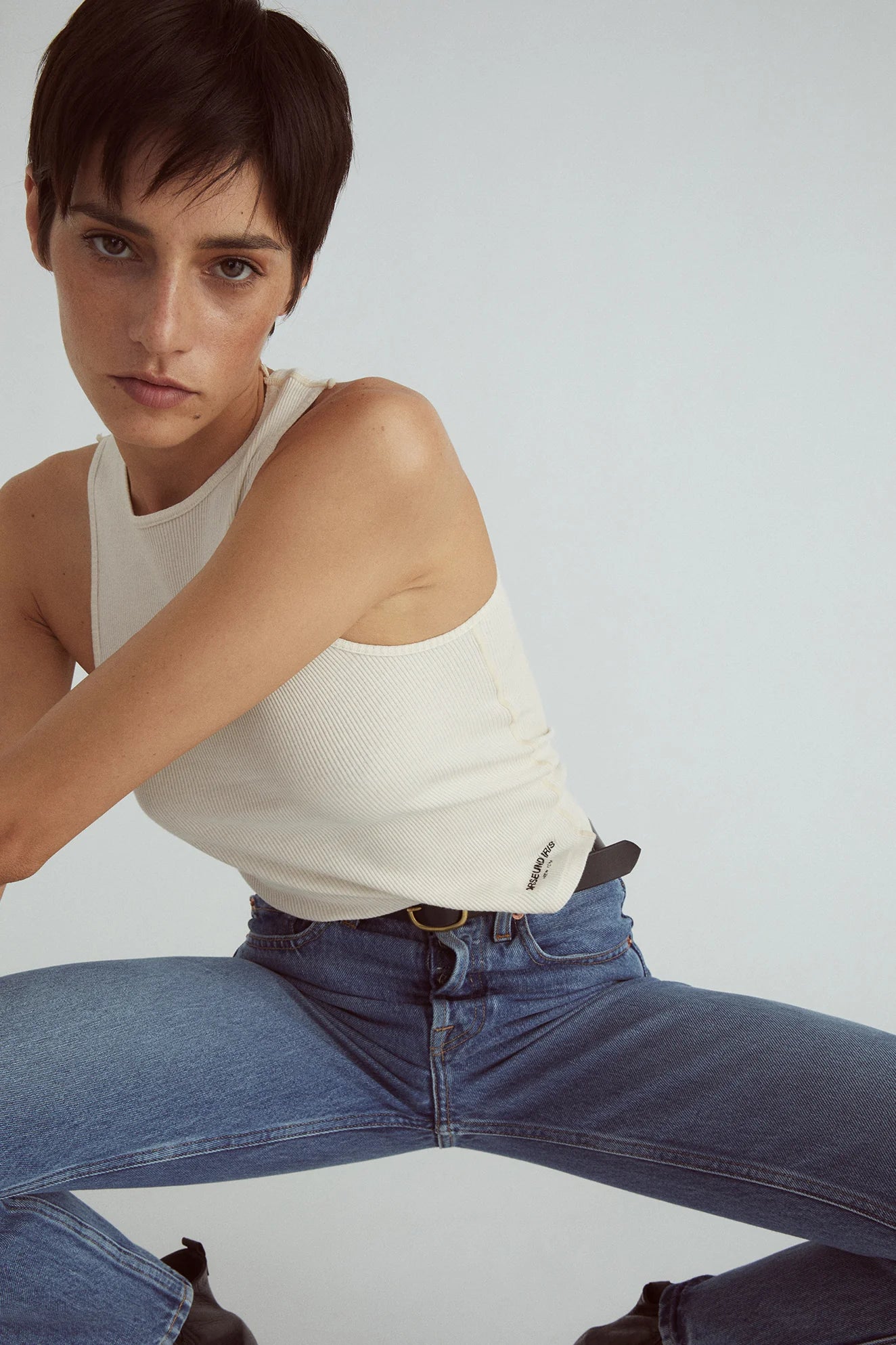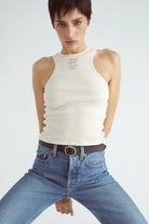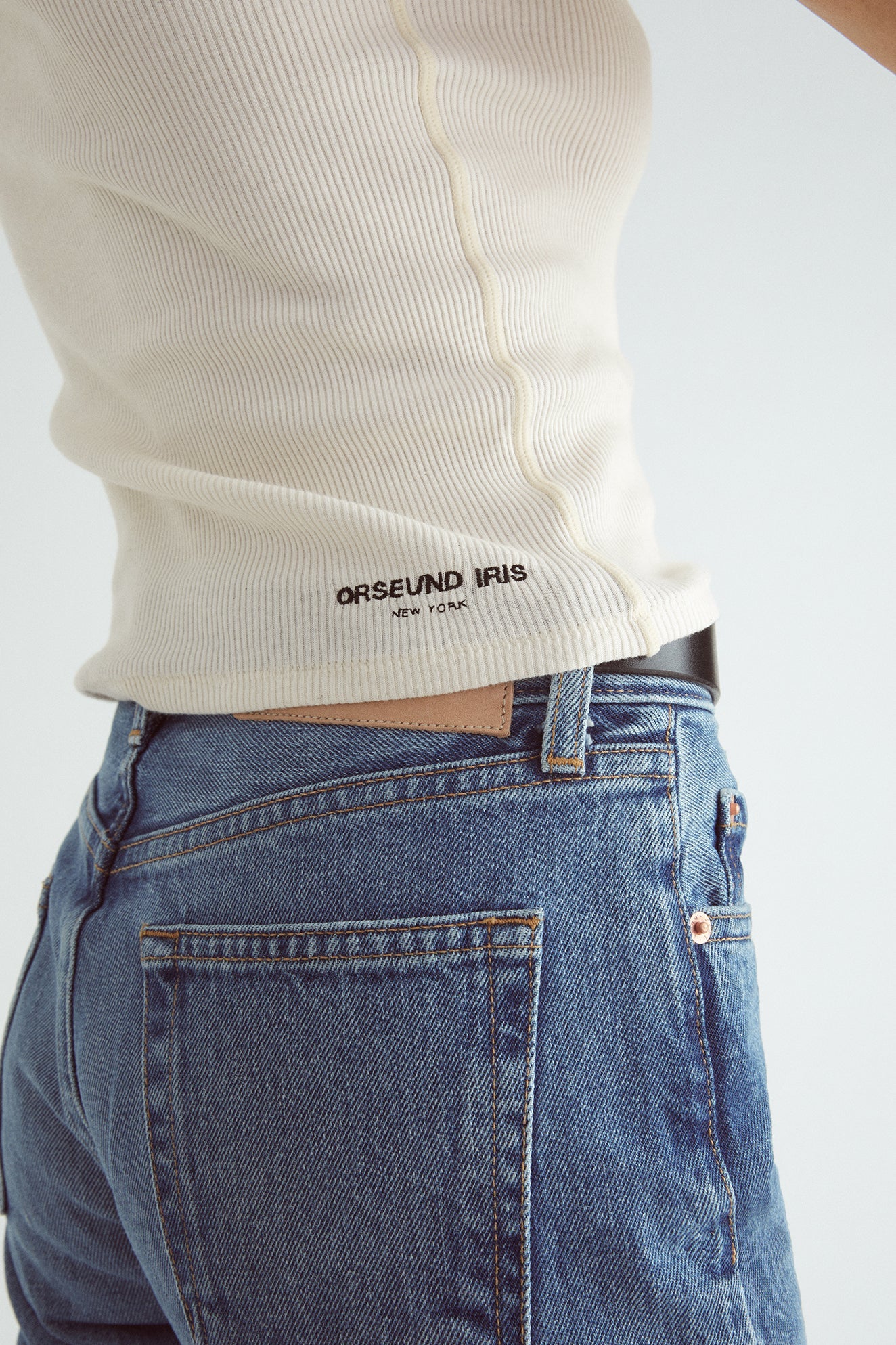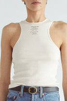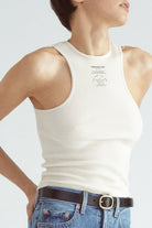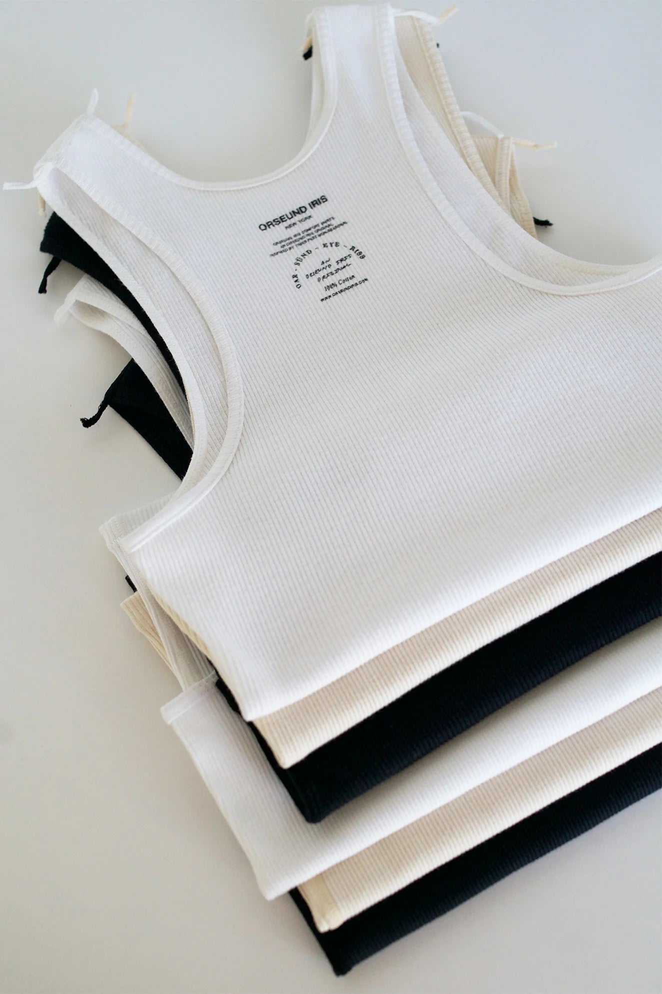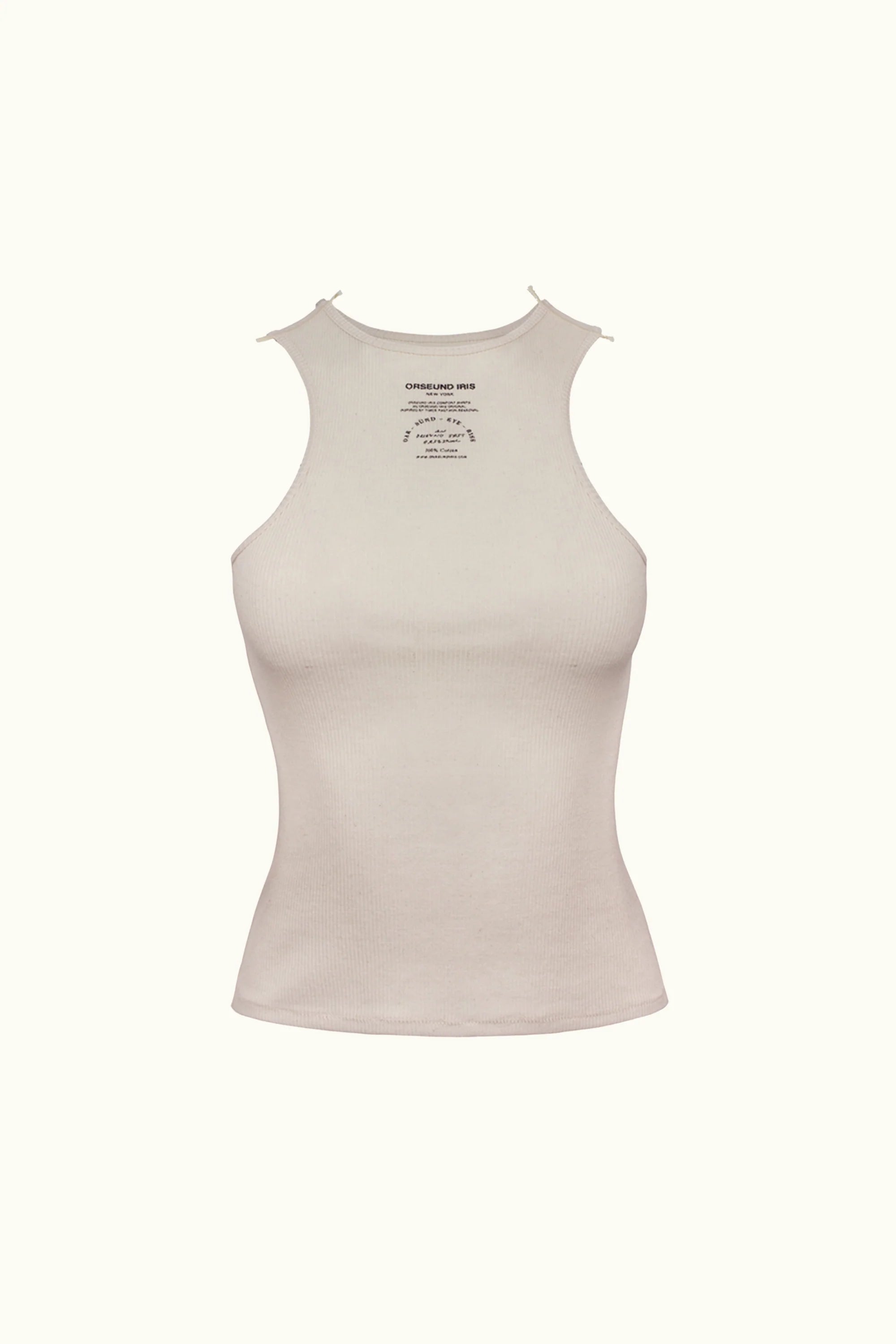 Reversible ribbed cotton tank. Slim racerback silhouette. Original heat transfer label at high neck, embroidered Orseund Iris at back. Serge thread detailing at shoulder seams. With wear, heat transfer label may fade for a more vintage inspired look.