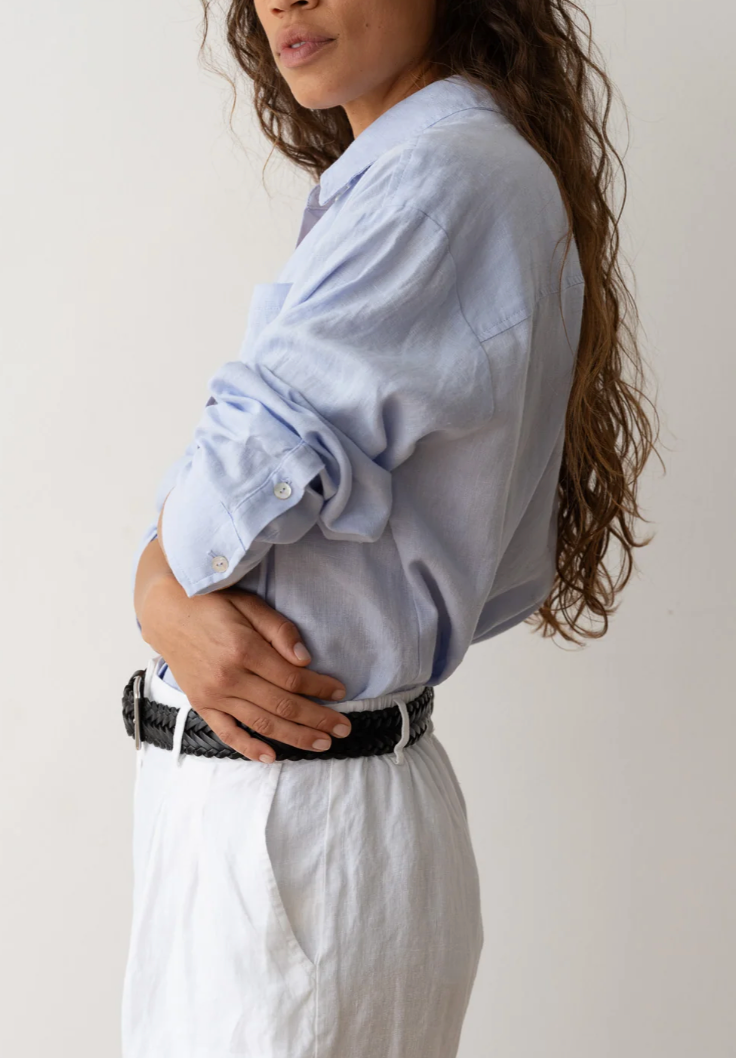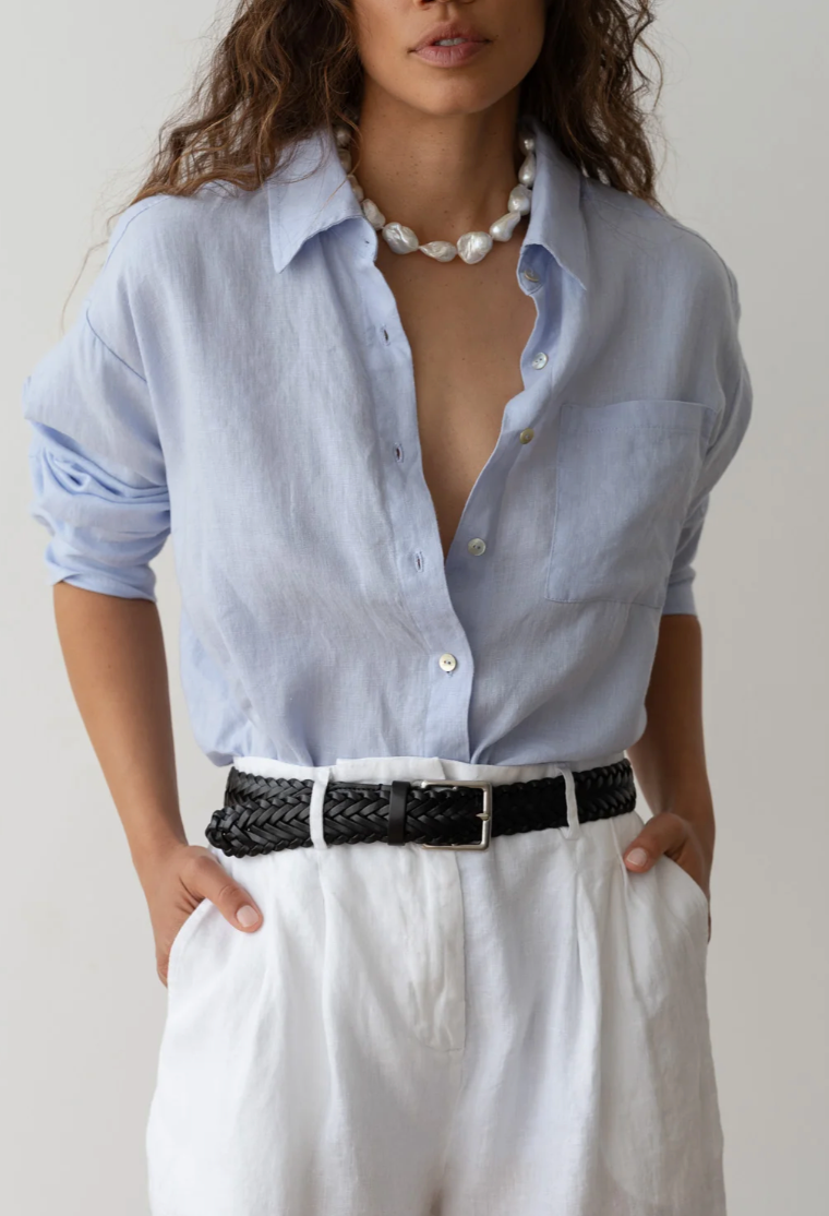 A summer shirting staple crafted from our lightweight linen fabric. This oversized button-down features a relaxed fit, two-buttoned cuffs, left chest pocket, and mother of pearl buttons.