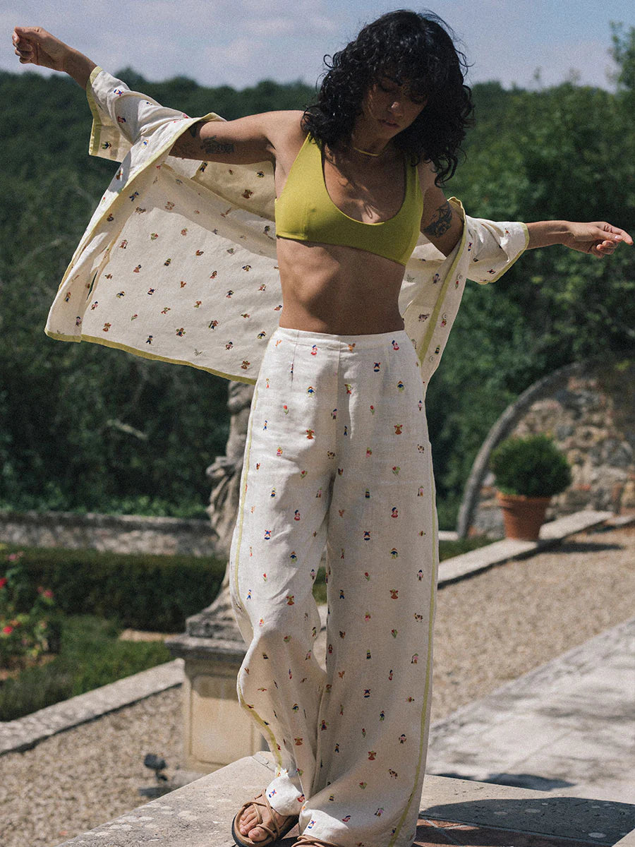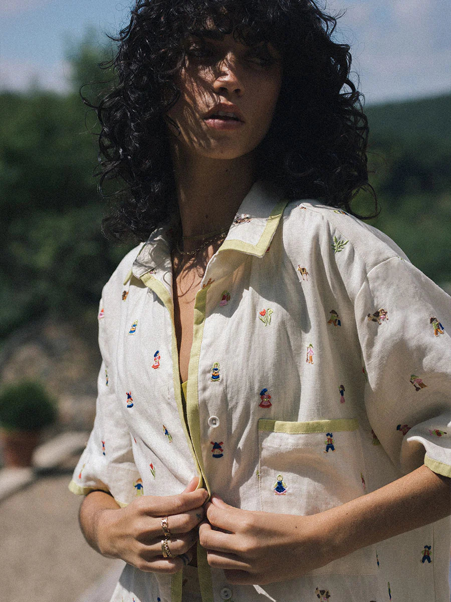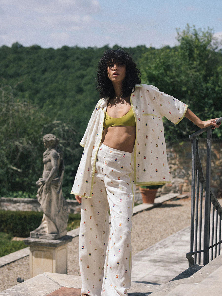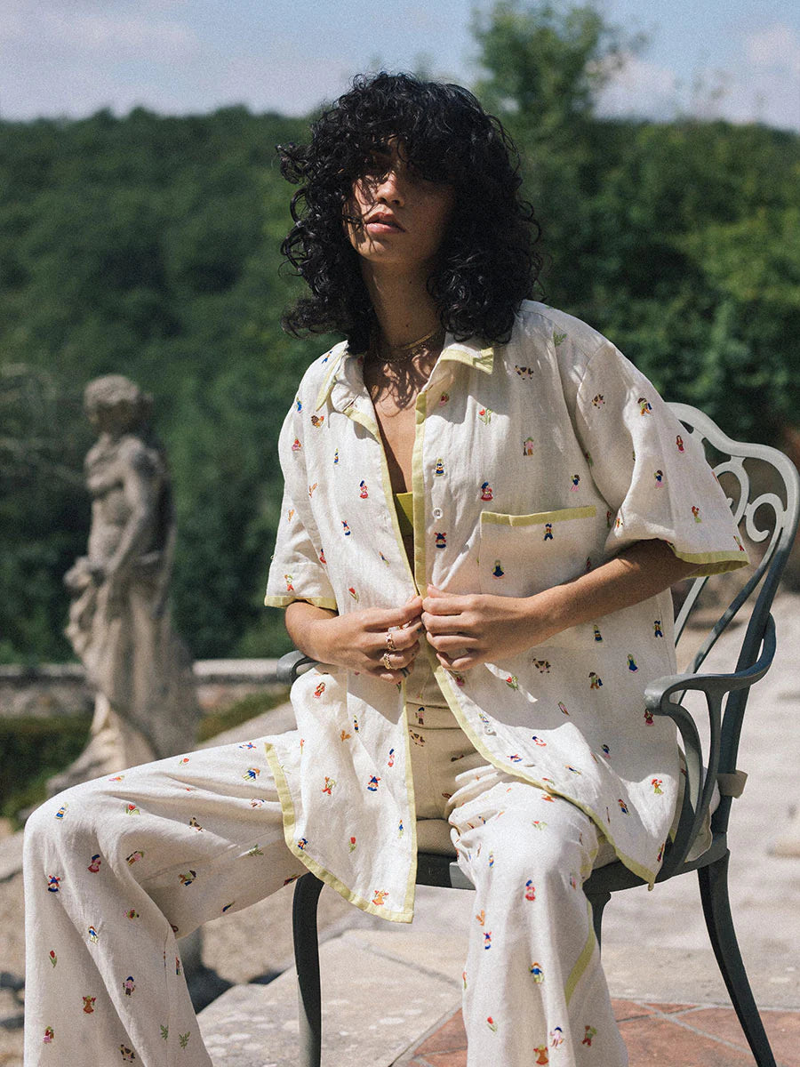 ‘Fellow’ features 100% linen meticulously embroidered all-over with charming farm-inspired motifs in vibrant hues on a solid cream base, inviting a whimsical touch of countryside camaraderie.