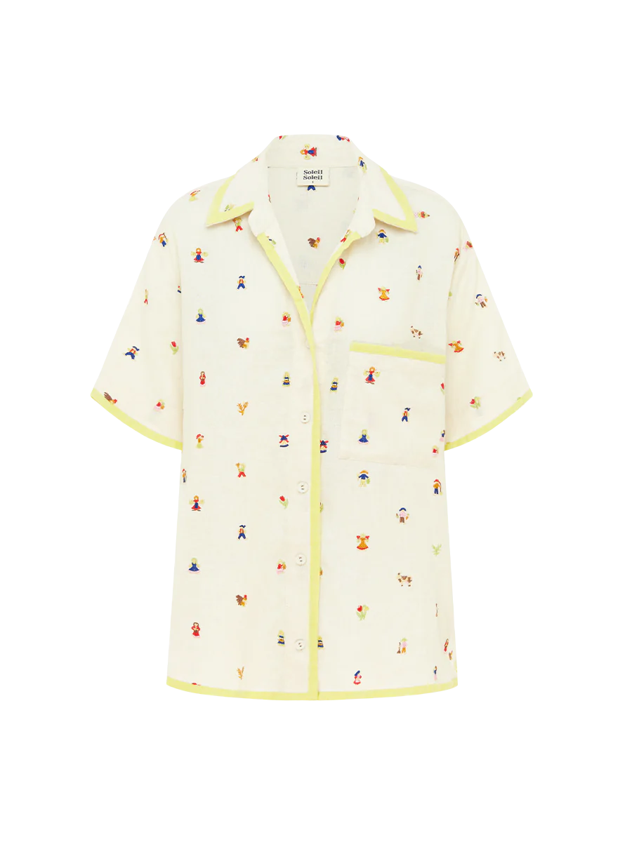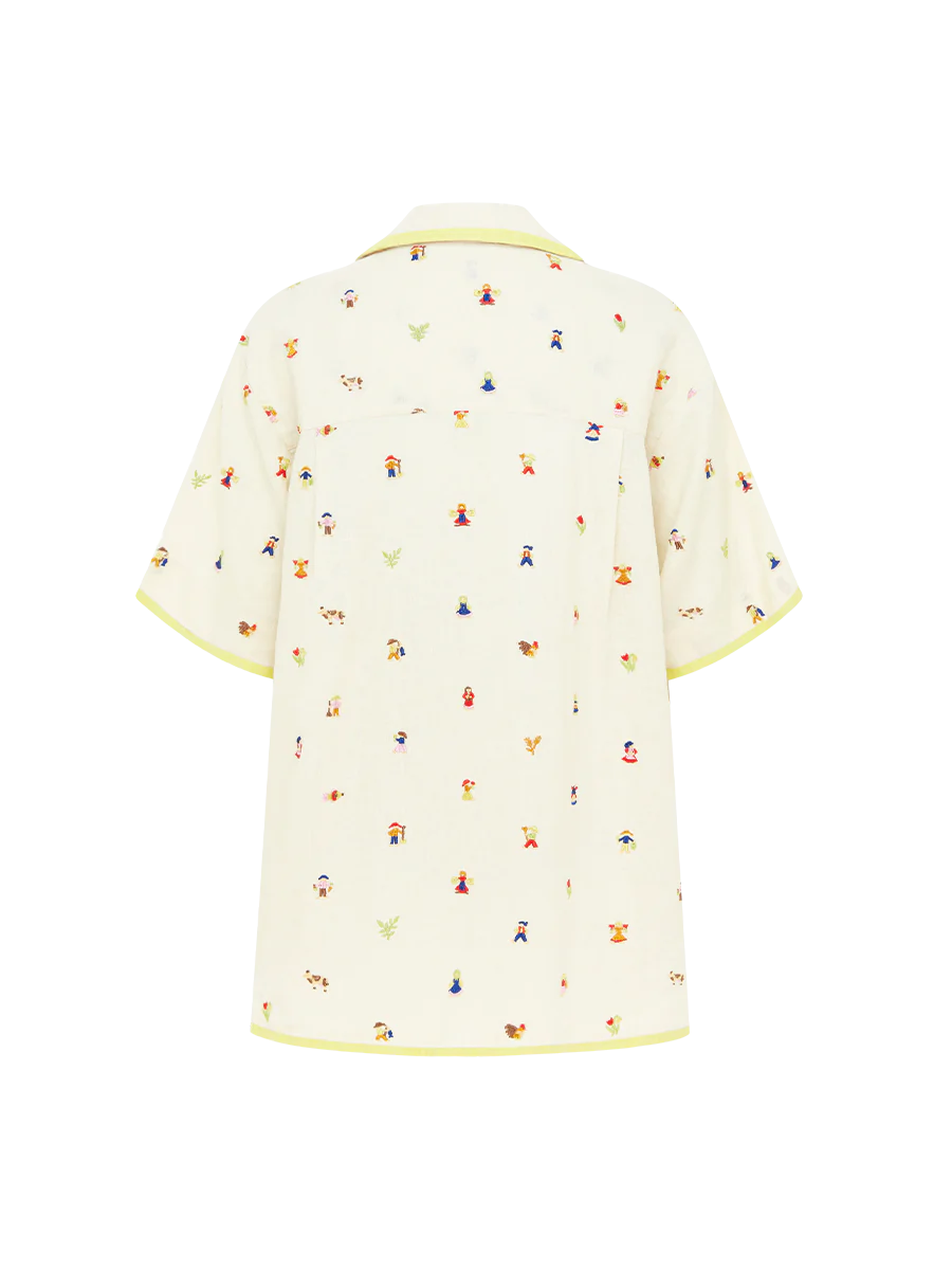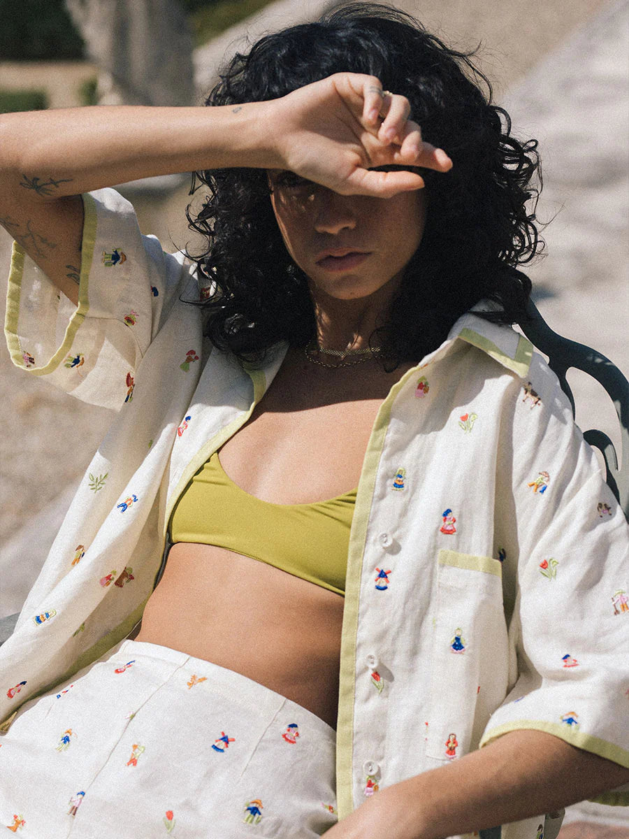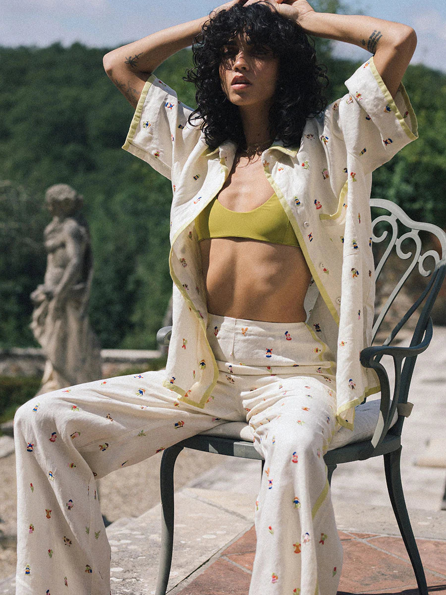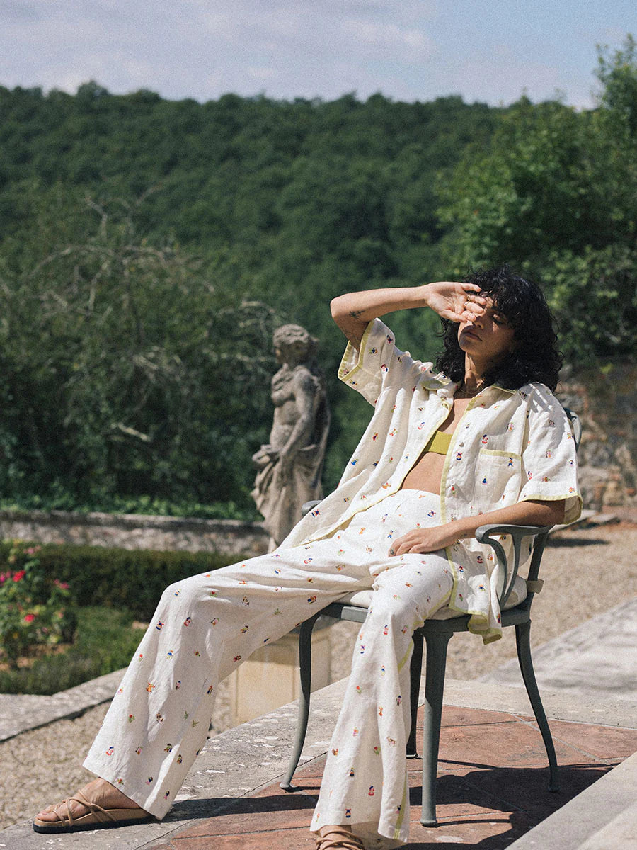 ‘Fellow’ features 100% linen meticulously embroidered all-over with charming farm-inspired motifs in vibrant hues on a solid cream base, inviting a whimsical touch of countryside camaraderie.