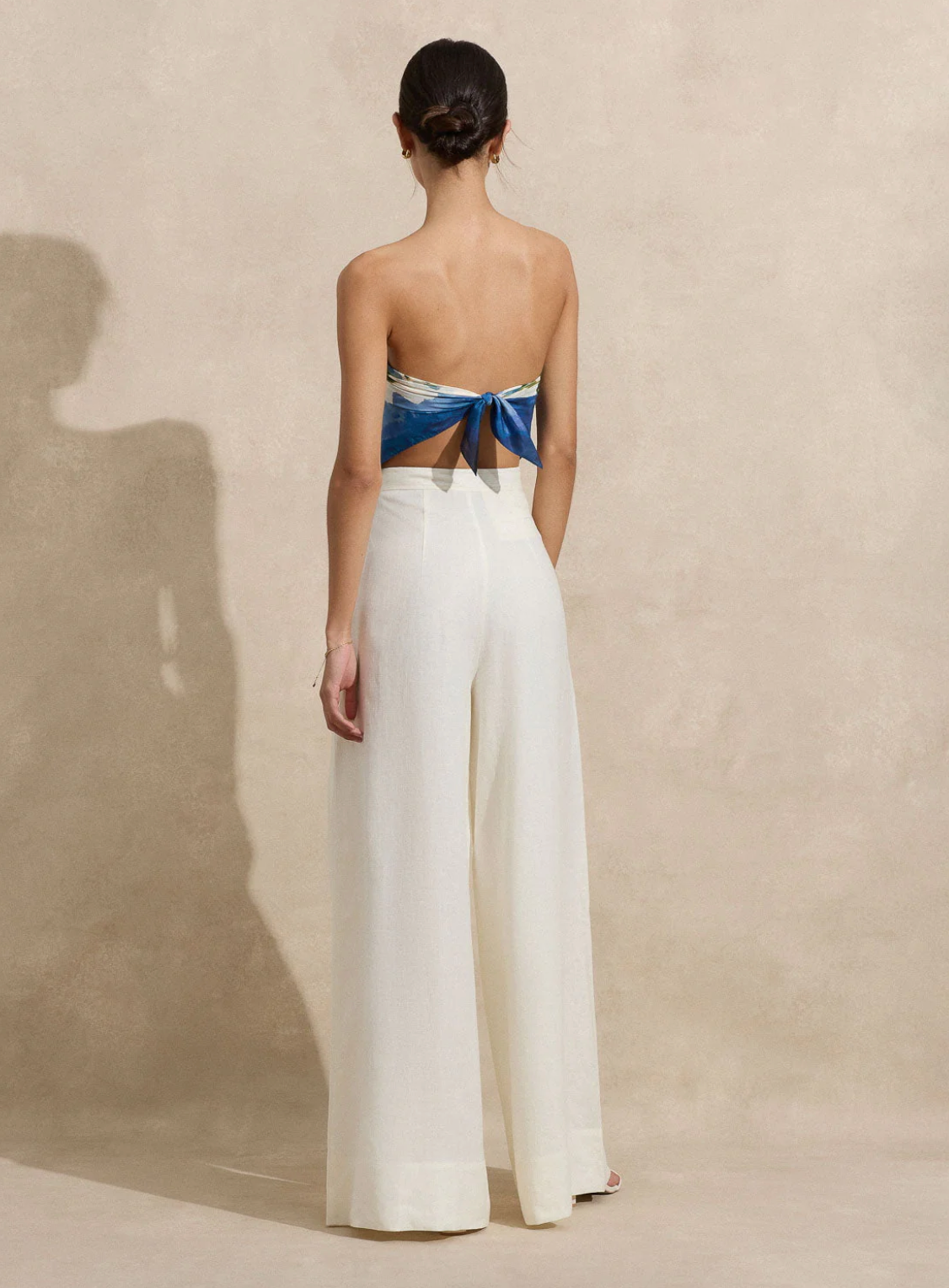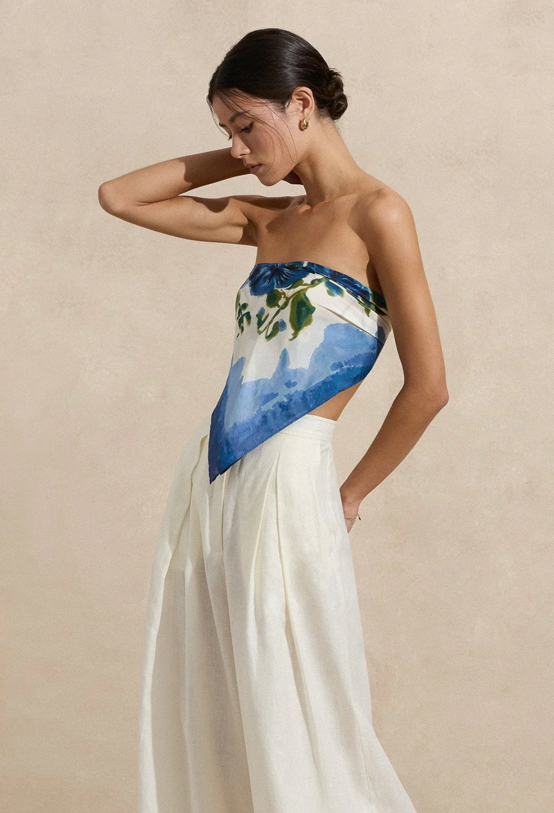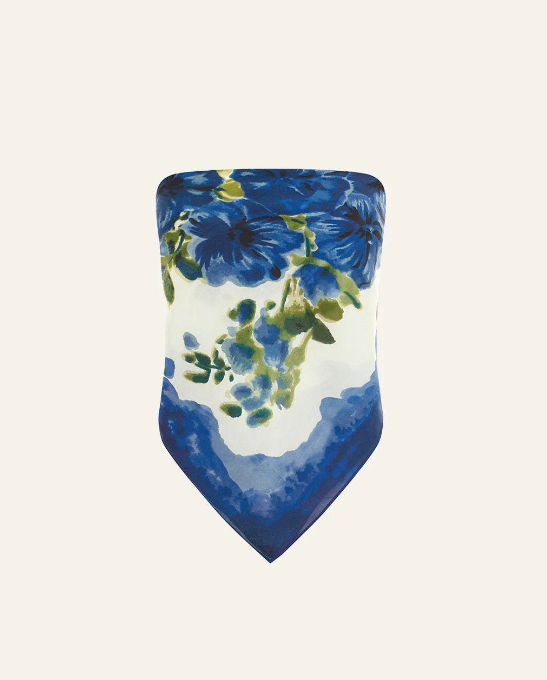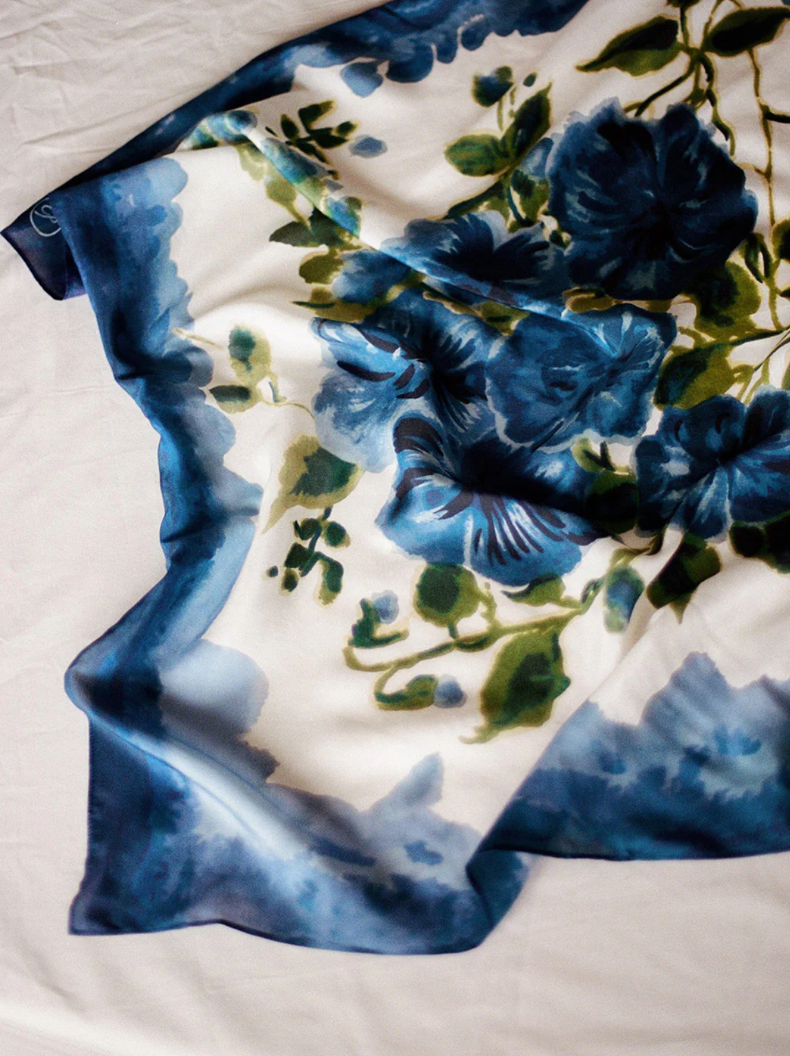Introducing our Signature Scarf in Marseille. Handpainted blooms decorate a versatile summer accessory with the peony monogram printed on the corners edge. Fold in half to create your dream scarf top, or find endless wearability secured as a headscarf or neck tie.