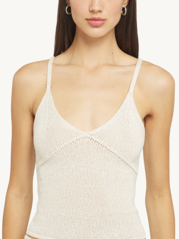 A scintillating thin-strap camisole with a V neckline, knitted from a our signature cotton-based yarn with micro-sequins throughout.