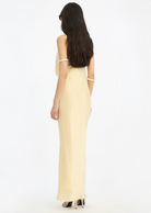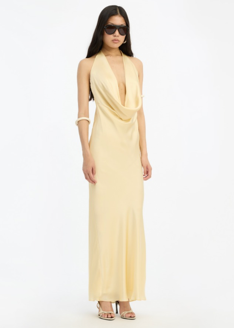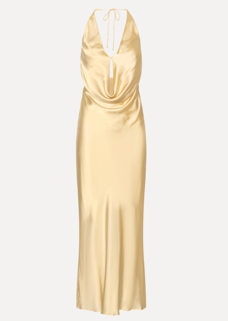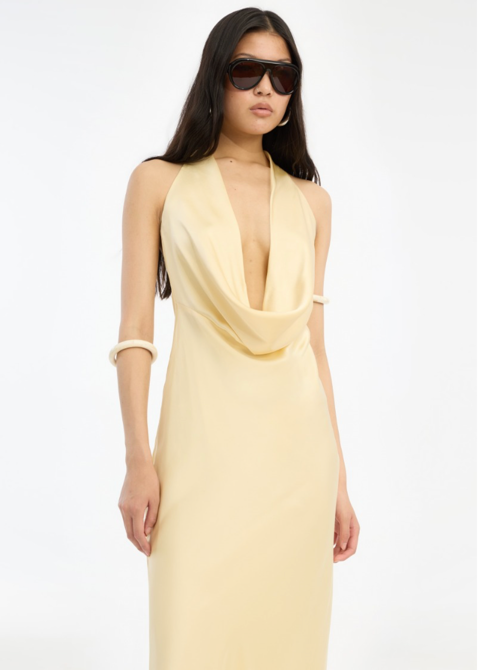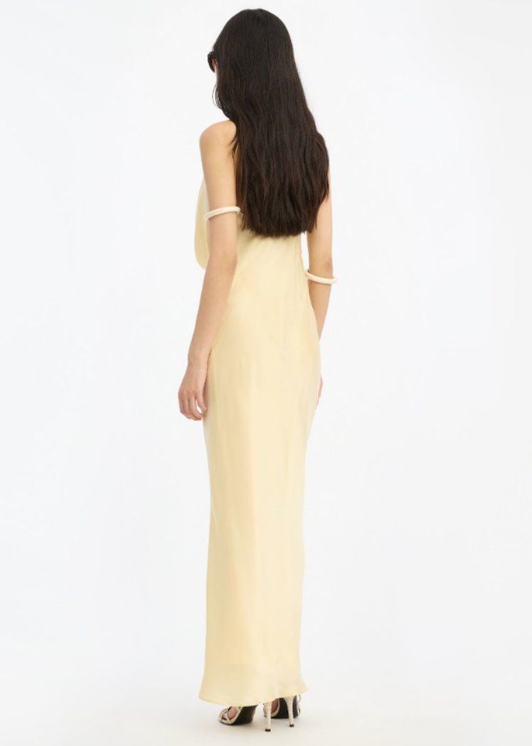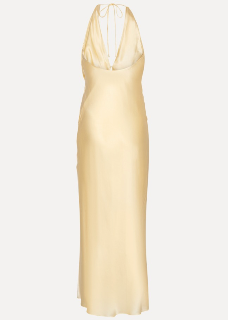 Chiffon halter dress in straw (soft yellow) is a long dress with an elegant drape. Designed with a halter neckline and a deep, draped front, it creates a fluid and refined silhouette. Crepe de chine is a lightweight, smooth satin-like fabric with a soft drape, subtle matte texture, and gentle crinkled finish that feels fluid and elegant against the skin. The dress is lined and finished with a softly flowing hem.