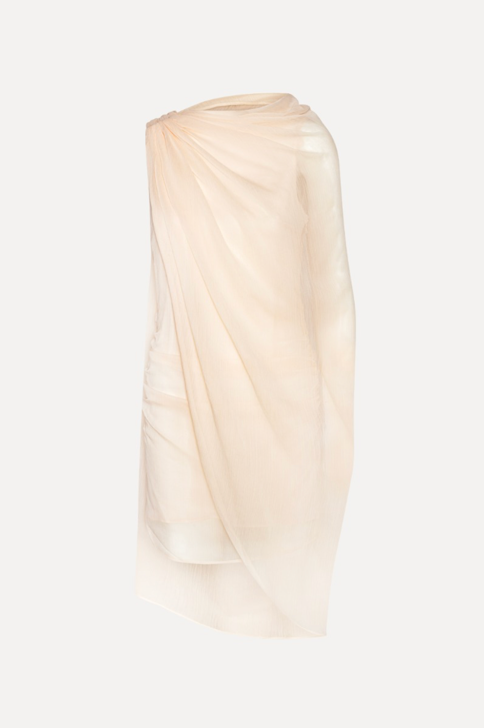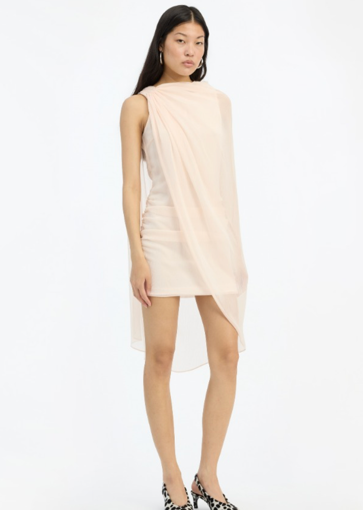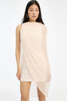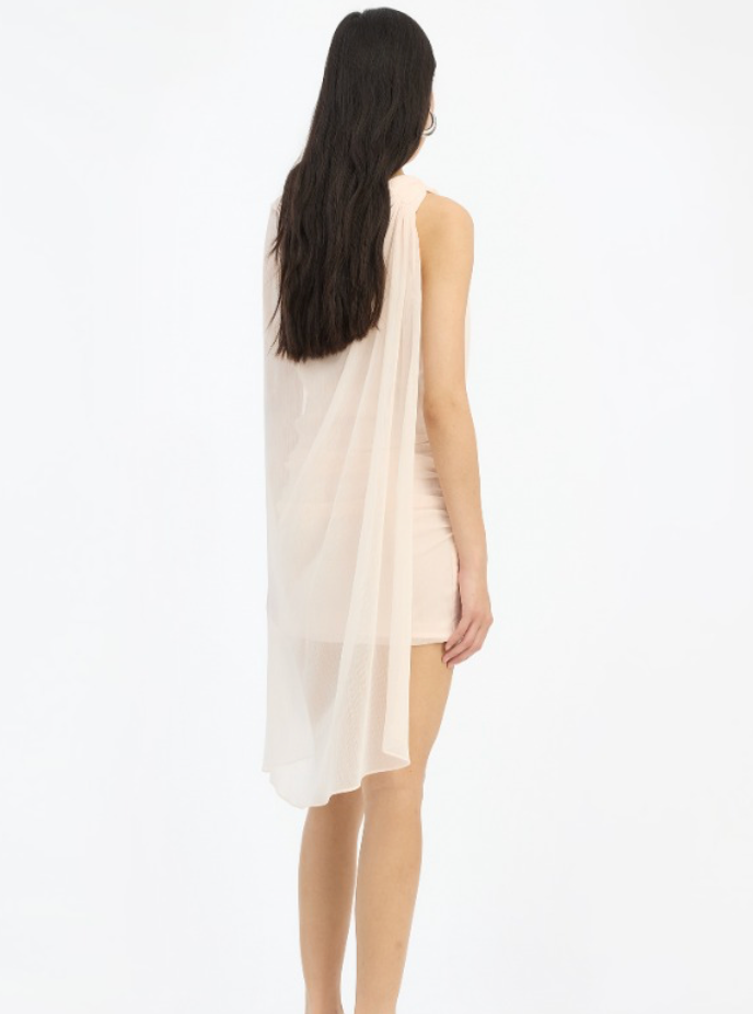 Chiffon mini cape dress in vanilla cream (light pink) is a mini dress crafted in lightweight chiffon with an asymmetric cape design. The dress features a draped upper section with soft folds and a semi-sheet outer layer that falls loosely around the body. It is lined and has a light, airy appearance with a clean and elegant silhouette.