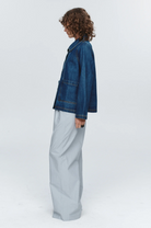 A boxy-fit jacket constructed from 100% organic cotton. Designed with a slightly cropped shape and relaxed proportions. Features include a pointed collar, three-button front placket and two oversized front patch pockets. Finished with topstitching along all major seams and hems for structural reinforcement and visual definition.