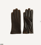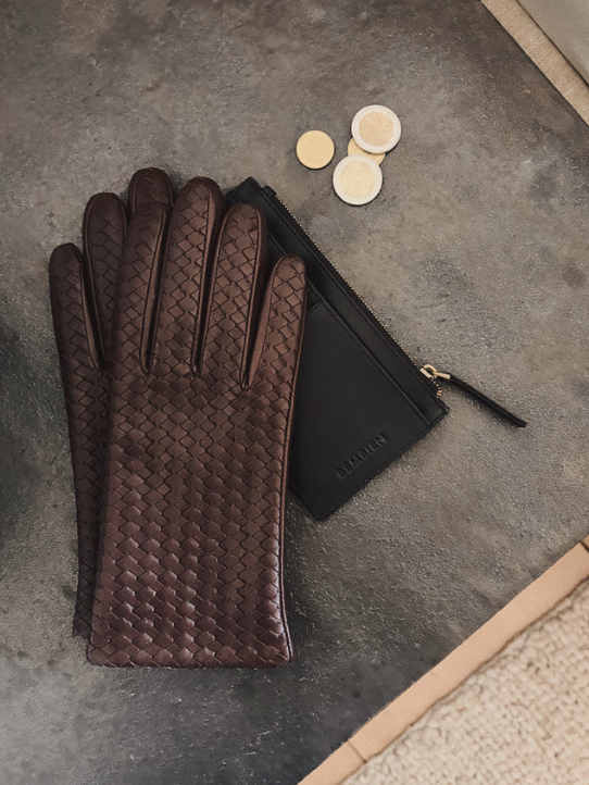 Elegant lambskin leather gloves made with handwoven leather on the back side and smooth leather on the palm side. Lined with soft cashmere for added warmth.