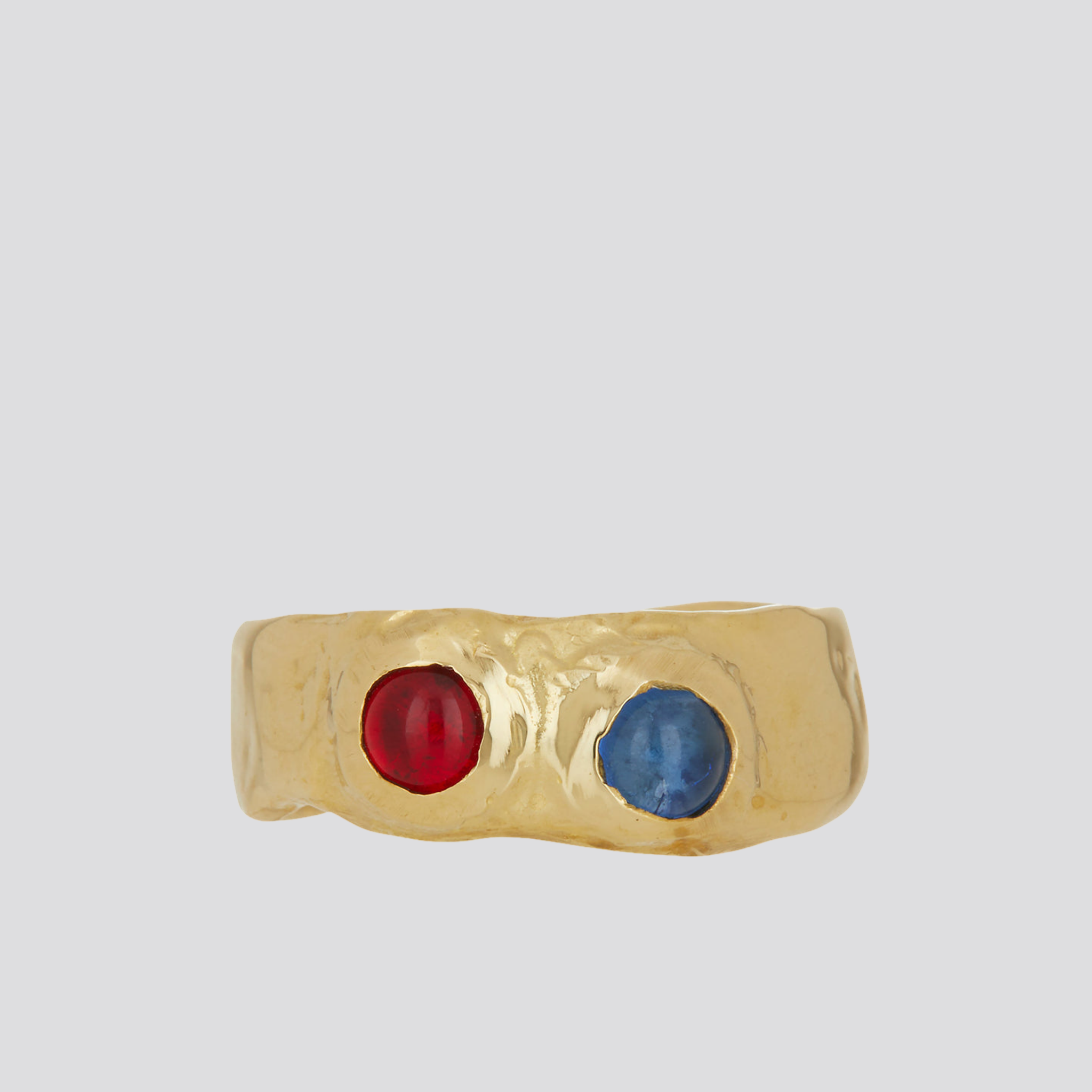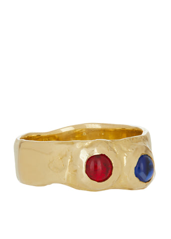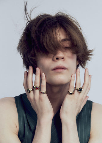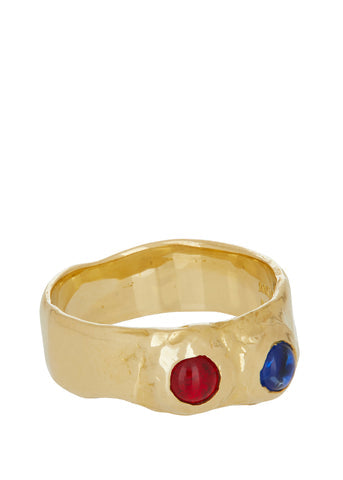 This ring set is made with brass and glass stones. The glass stones are available in multiple colors. The ring is also available in sterling silver, 14k with glass stones, and 14k with semi-precious stones. Our size guide can help you choose the right size for you.