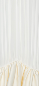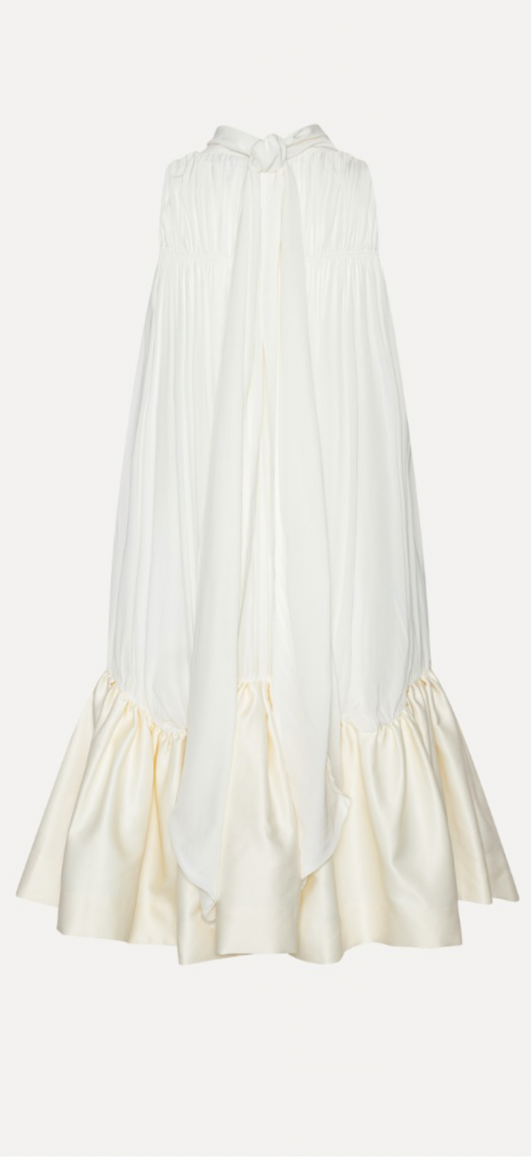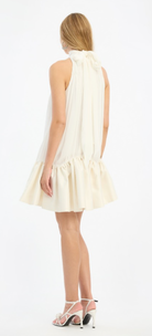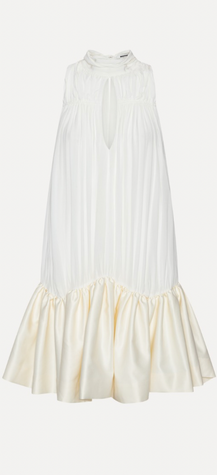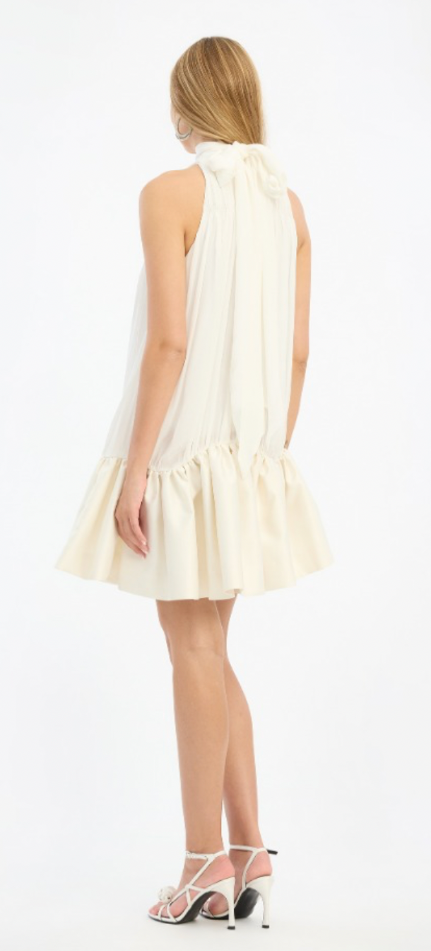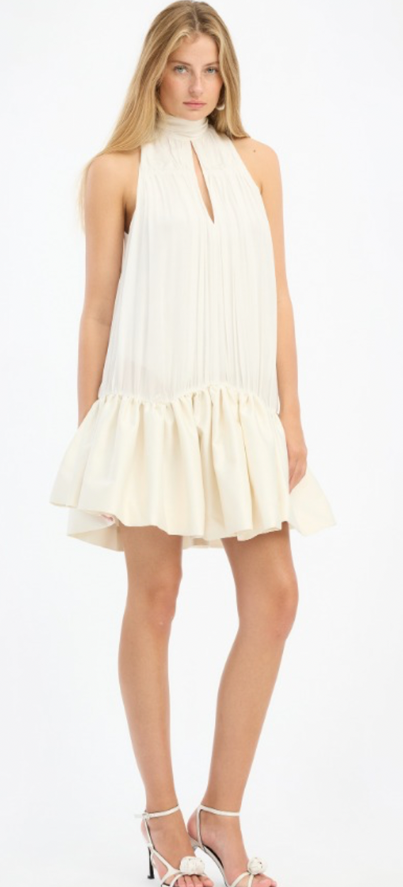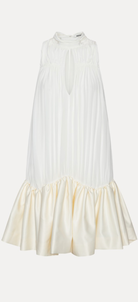 Gathered mini dress in egret (white) is a sleeveless mini dress with a high neckline and a deep front slit. The design features a lightweight pleated upper body that falls loosely from the shoulders, gathers at the hips where the skirt is finished with a wide flounced hem in a contrasting material. the back is detailed with a tie closure at the neck, creating an airy and voluminous silhouette.