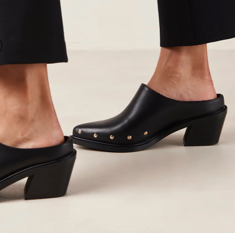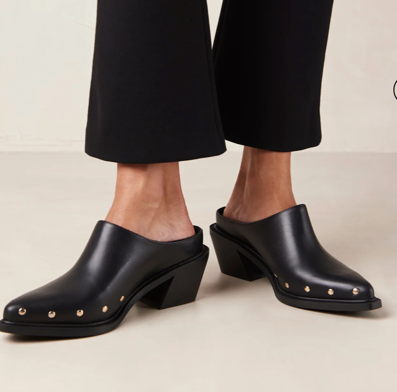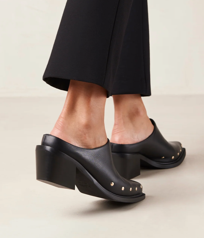Crafted from sleek black leather, the Lorenzo Mules by ALOHAS boast shimmering silver studs that outline the elongated shape.