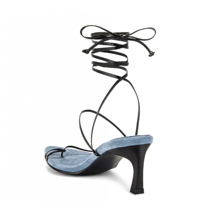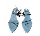 These Reike Nen black and water blue Gladiator sandals are a unique and stylish addition to any wardrobe! The sandals feature a strappy, wrap-around design with a kitten heel, making them perfect for a night out or a special occasion. These sandals are brand new and come with the original box.