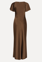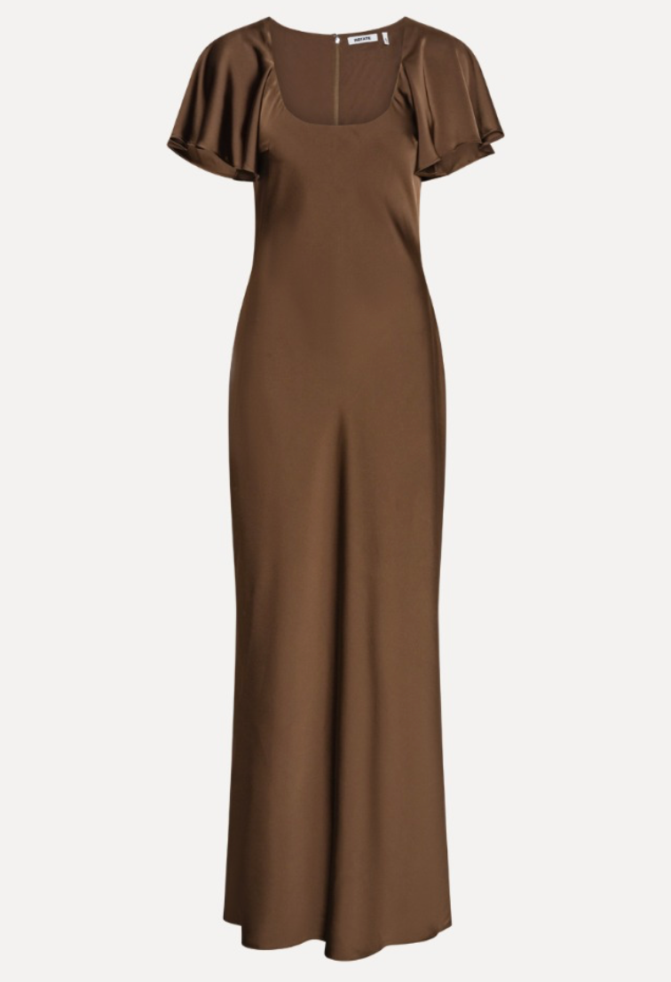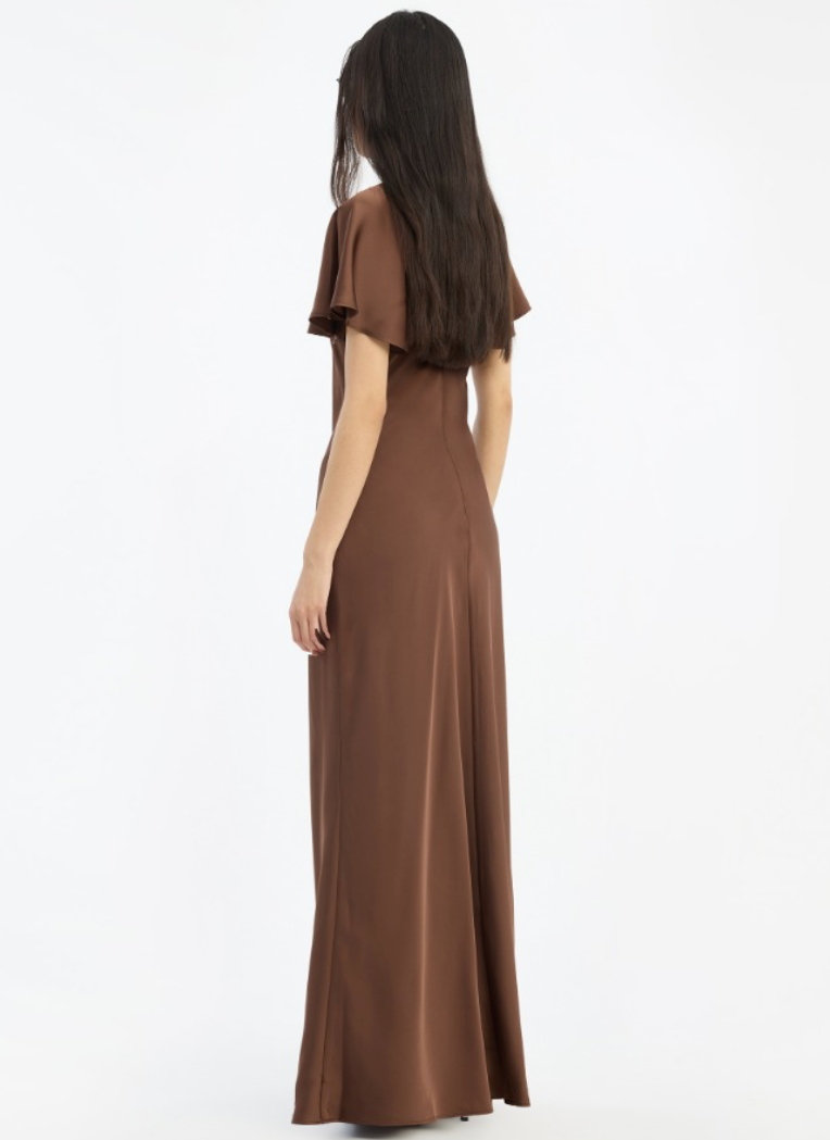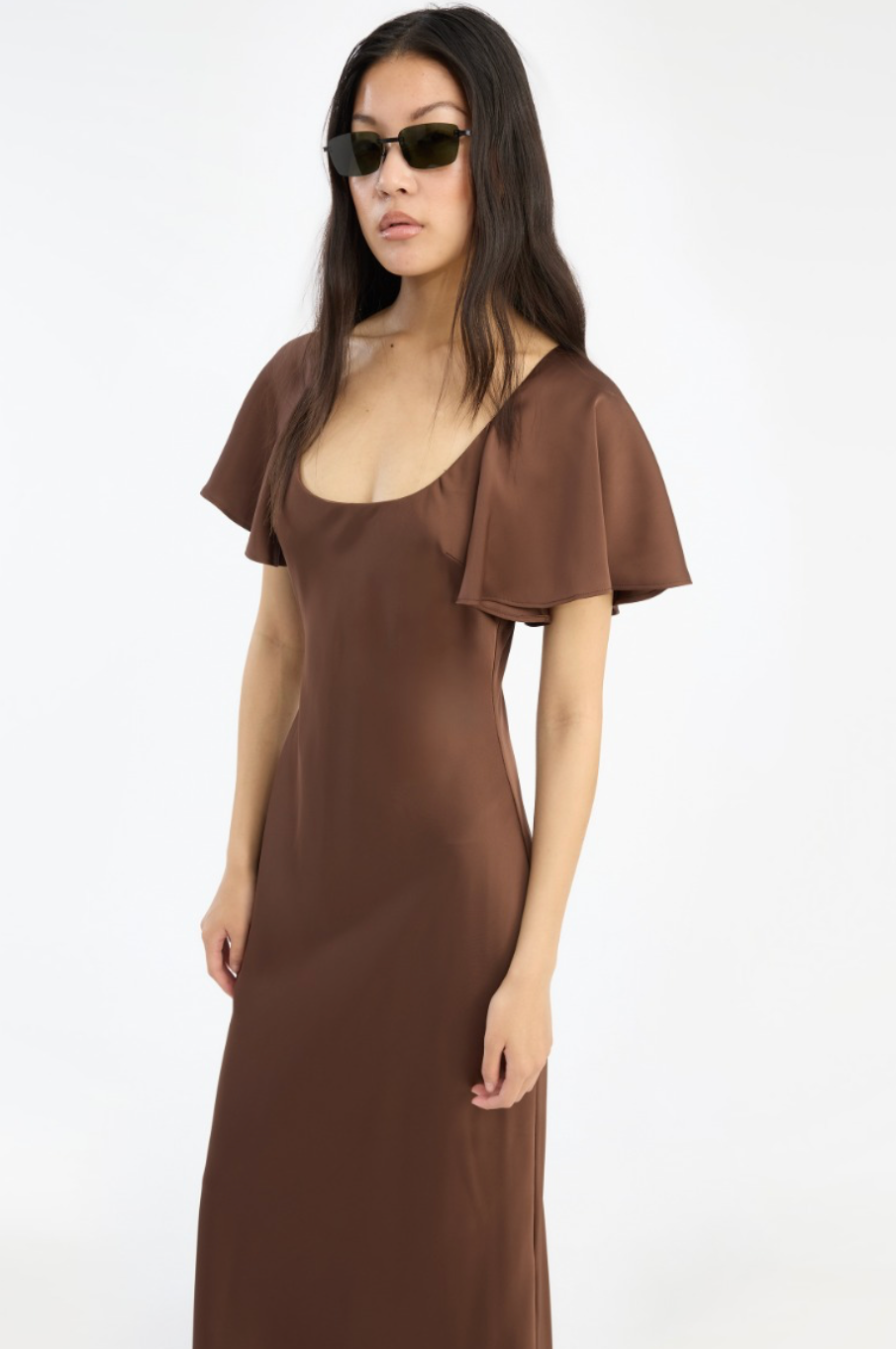 Satin flowy sleeve dress in soil (dark brown) is a floor-length dress with a square neckline and short, flowy sleeves. The silhouette is lightly fitted and falls smoothly along the body for a clean and elegant look.