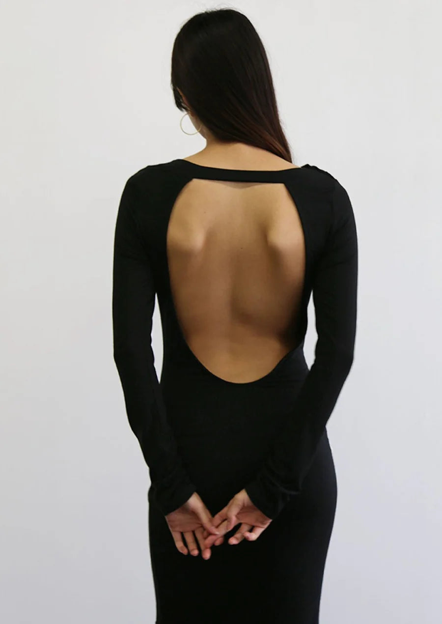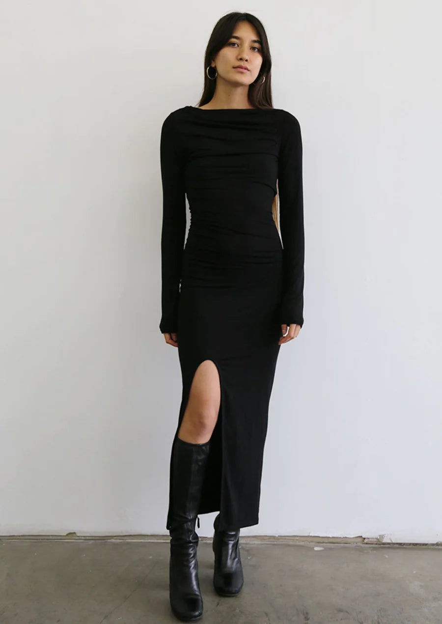 The Simone, our cut out back long sleeve dress featuring a draped neck and an above-the-knee slit. This dress is self lined / double layered to ensure support. Made from our soft micro modal jersey.