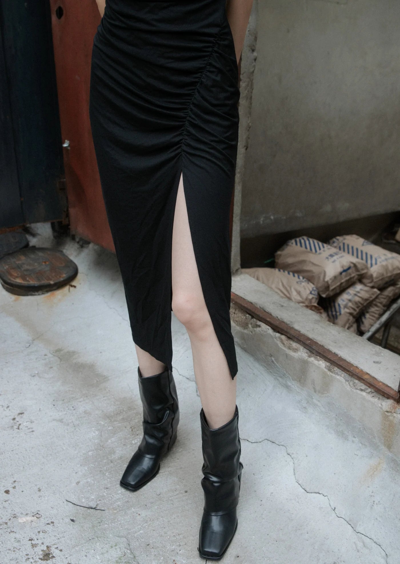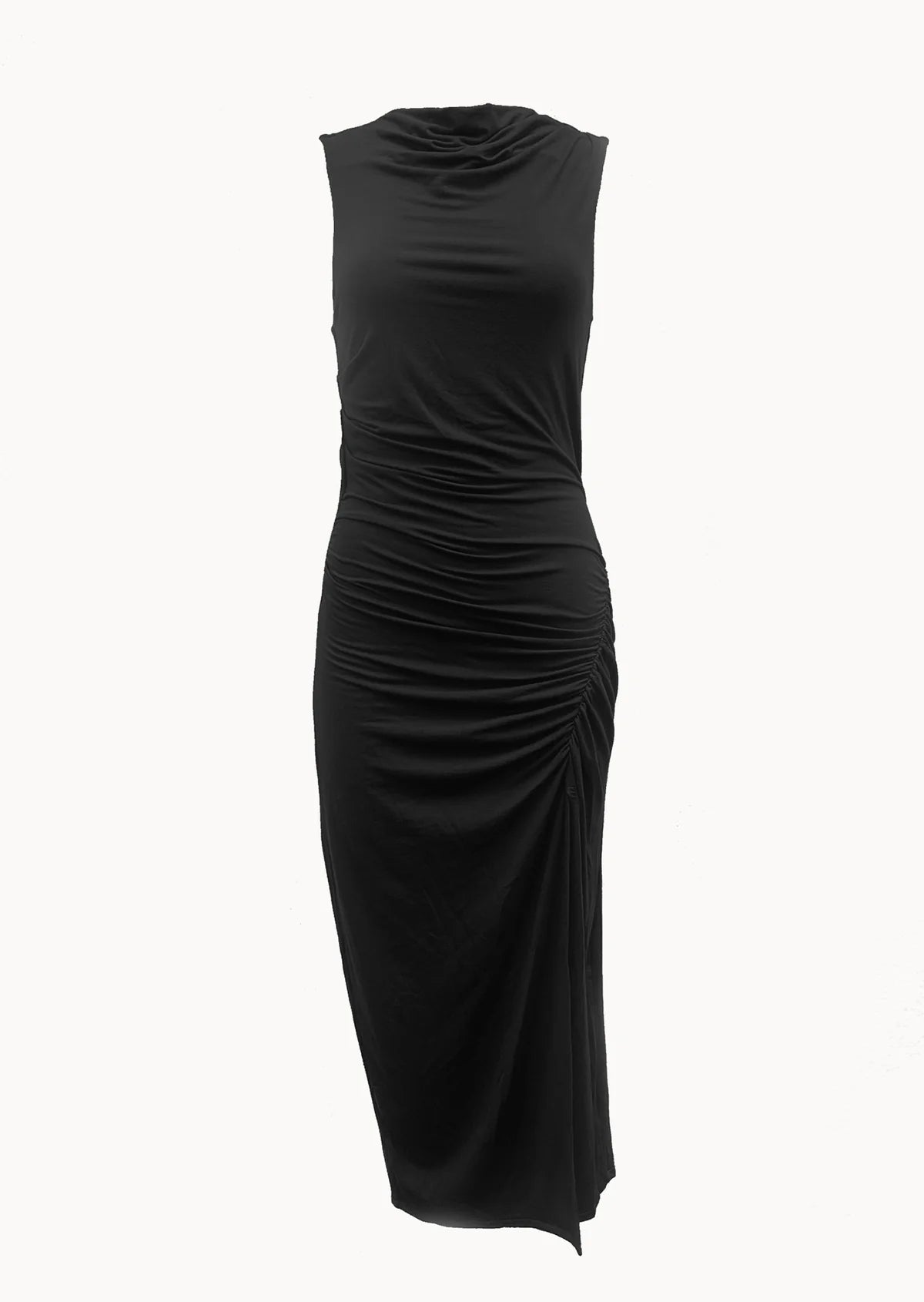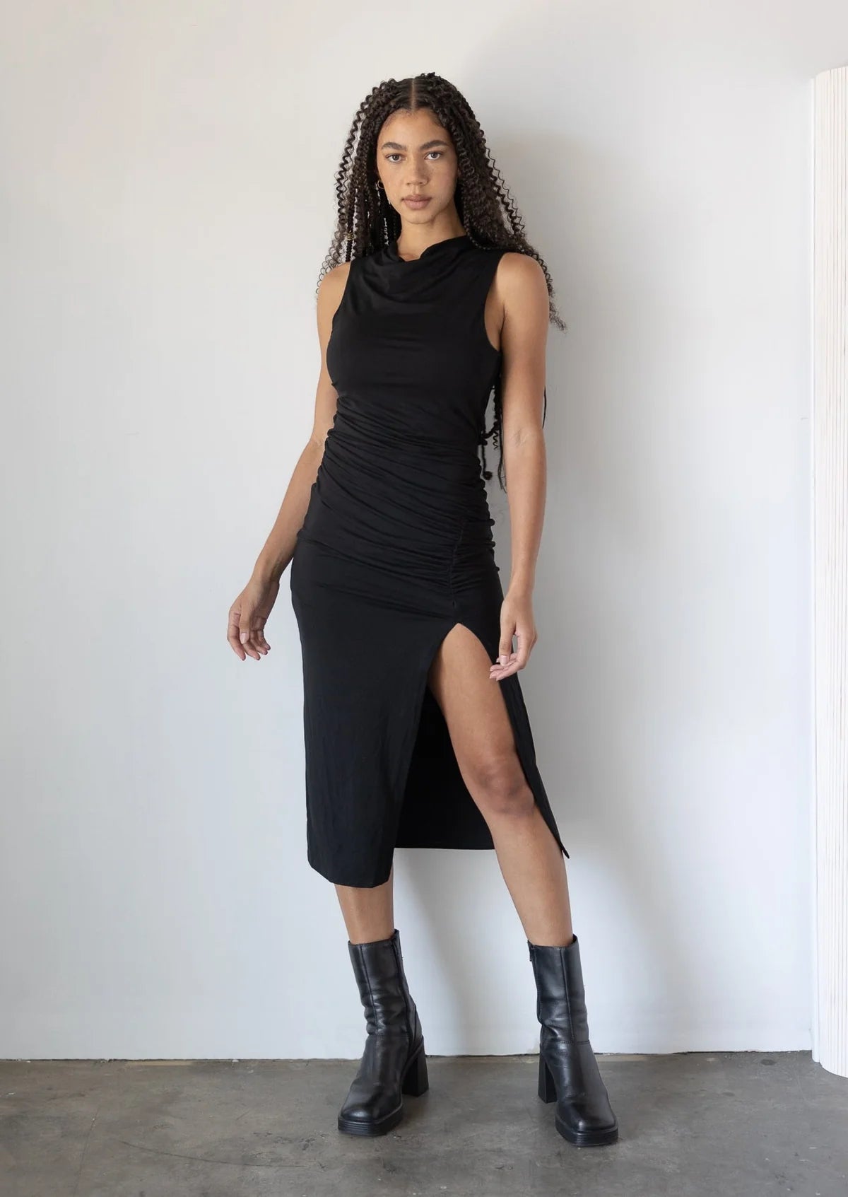 The Soto, a draped and cinched sleeveless dress featuring an above-the-knee slit. This dress is self lined / double layered to ensure support. Made from our signature micro modal jersey