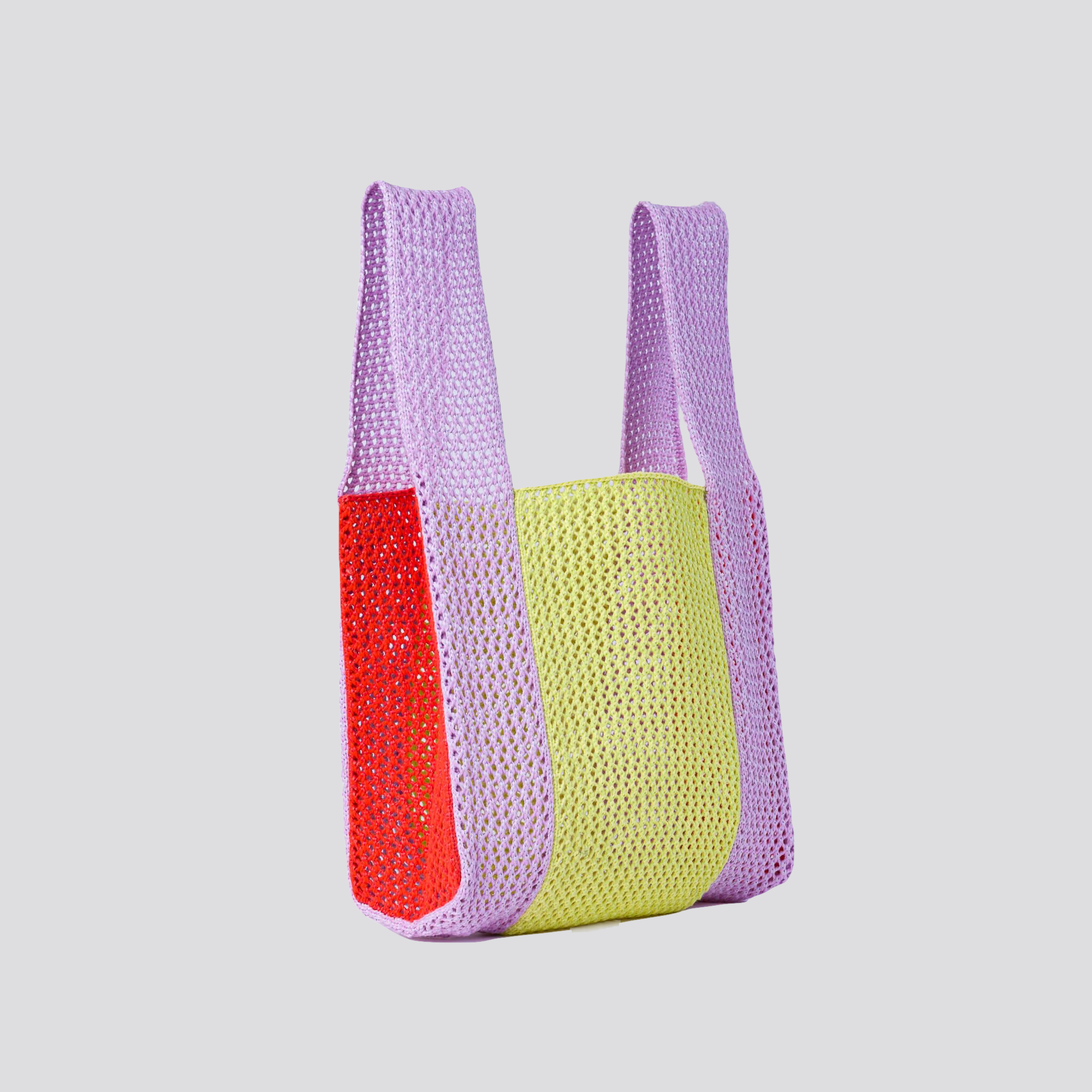 Introducing your new go-to beach bag! This statement-making t-shirt bag is made from repurposed deadstock raffia and yarn, and features a colorblock body and handles. The lightweight yet sturdy crochet-style knit construction makes it perfect for carrying all your beach essentials, and it's also available in a mini size.