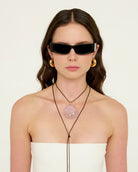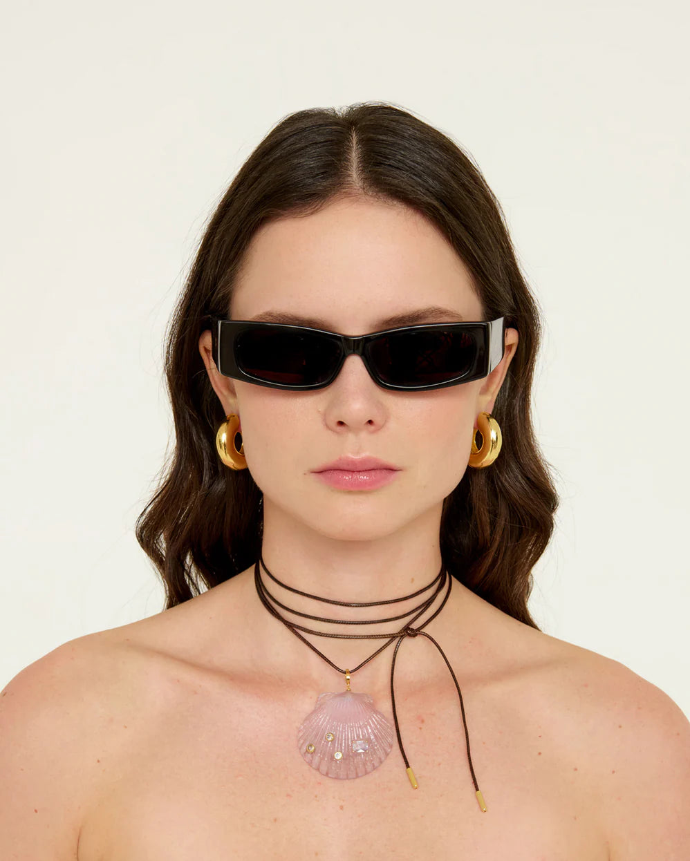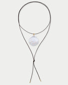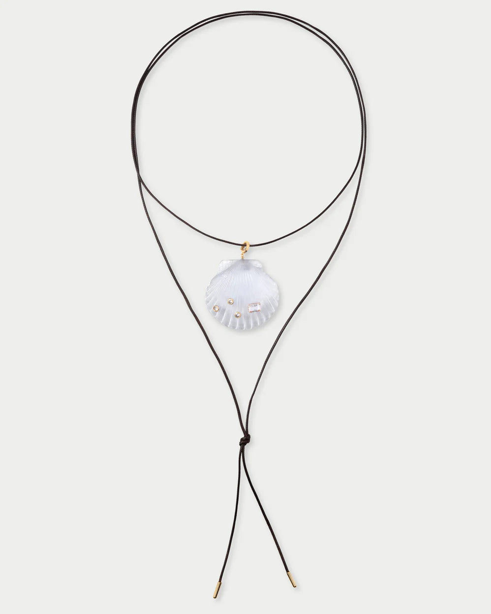 Our Vieira Wrap features a sculptural resin shell pendant suspended from an adjustable leather cord. The pendant captures the ridged, fan-like form of a scallop shell, accented with delicate cubic zirconia details.