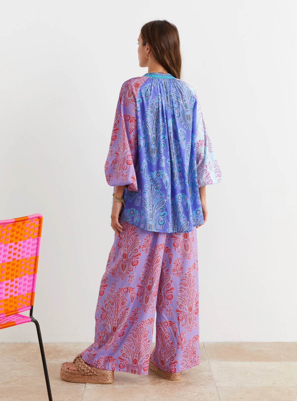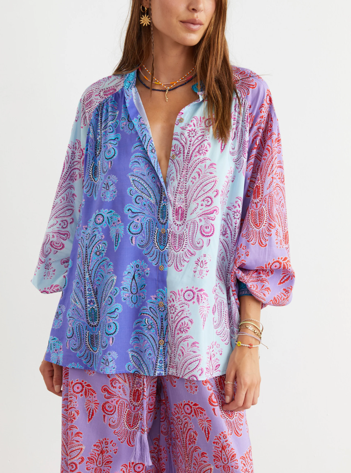 Longer length button-through blouse with intricate gathered details at sleeve head and back. Full sleeve length with fixed cuff and button fastening.